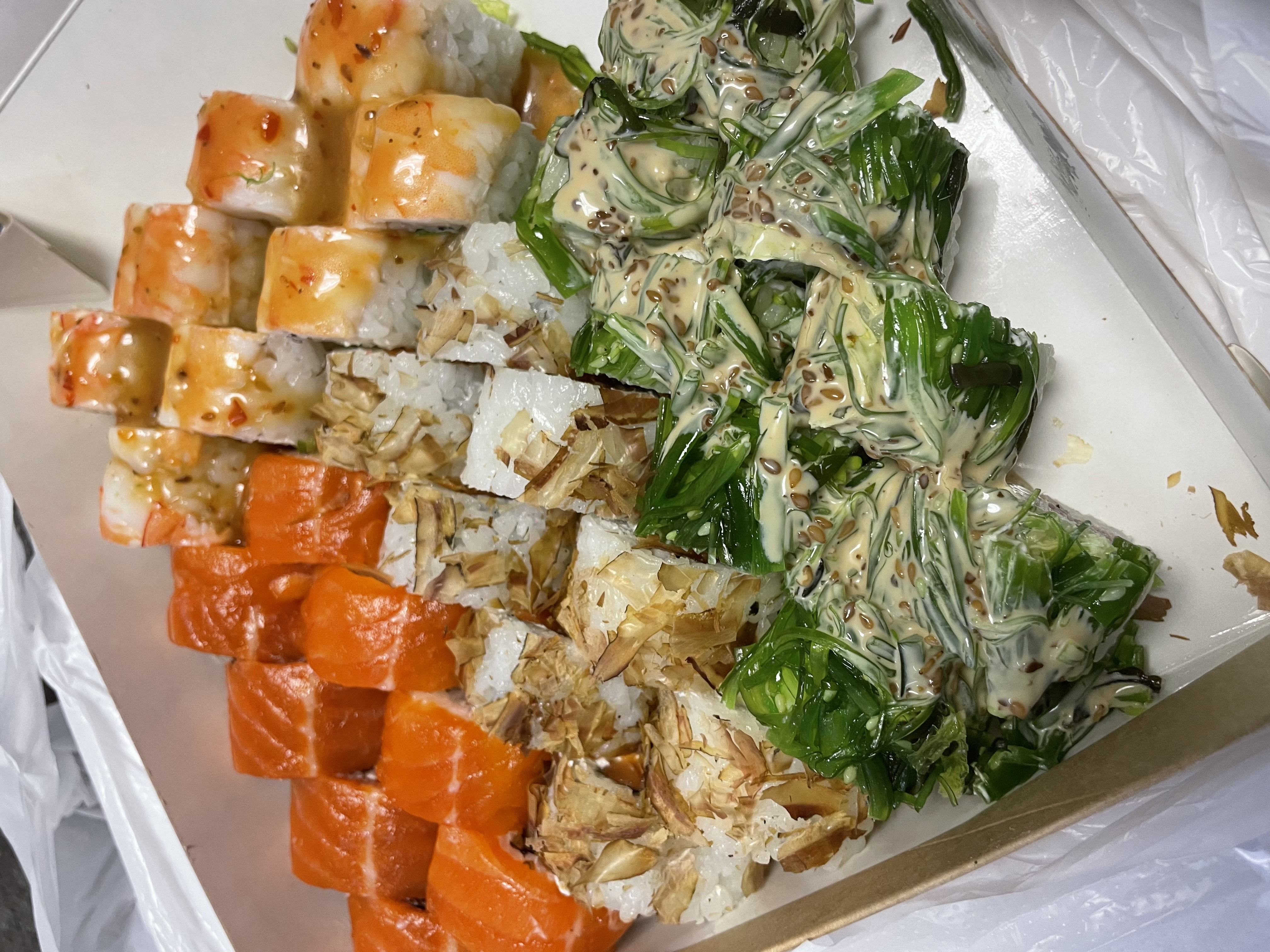 - "Магуро грин": филе тунца, сливочный сыр, салат Айсберг, салат чука, сурими, соус ореховый классик - 8 шт
