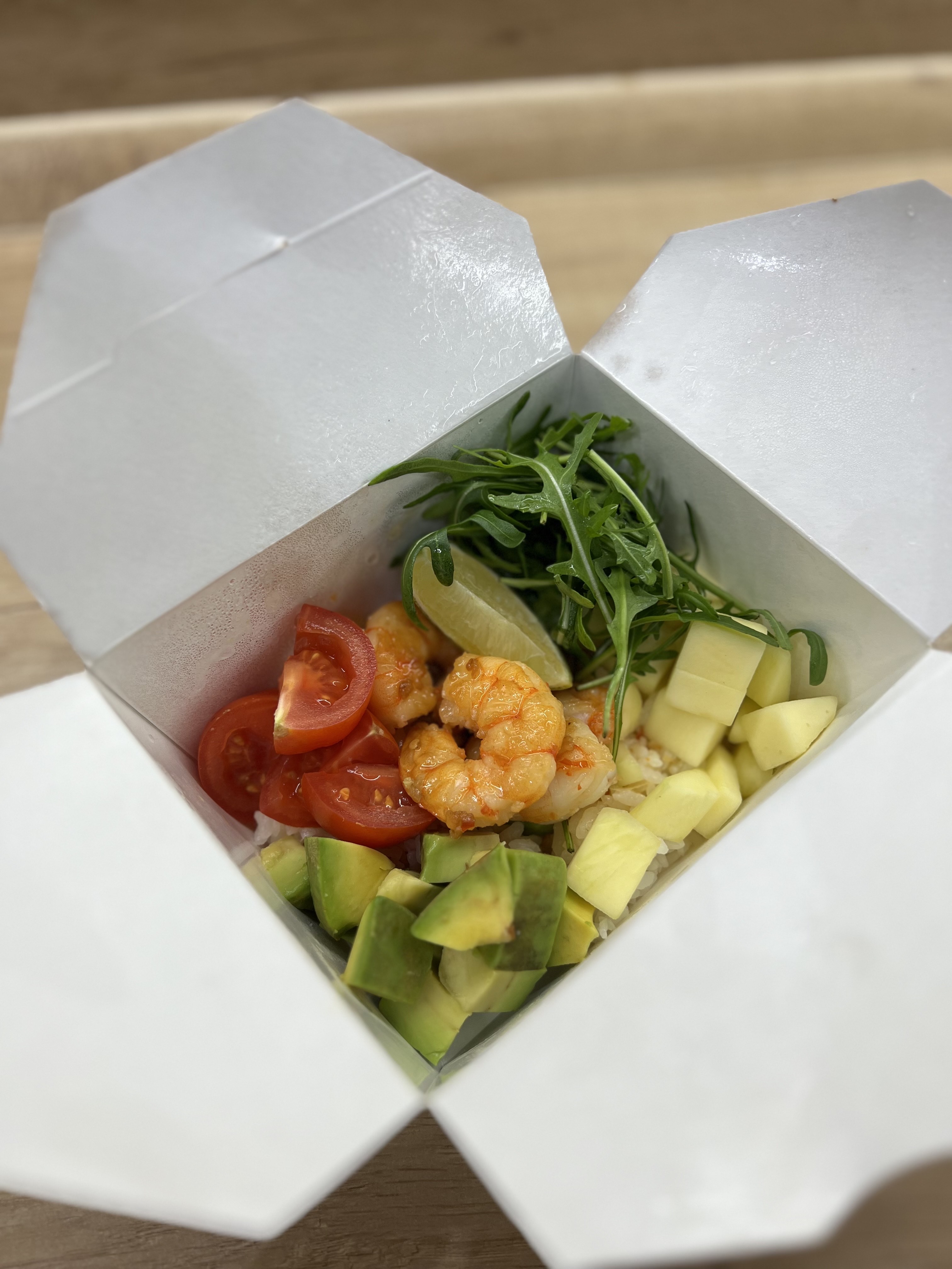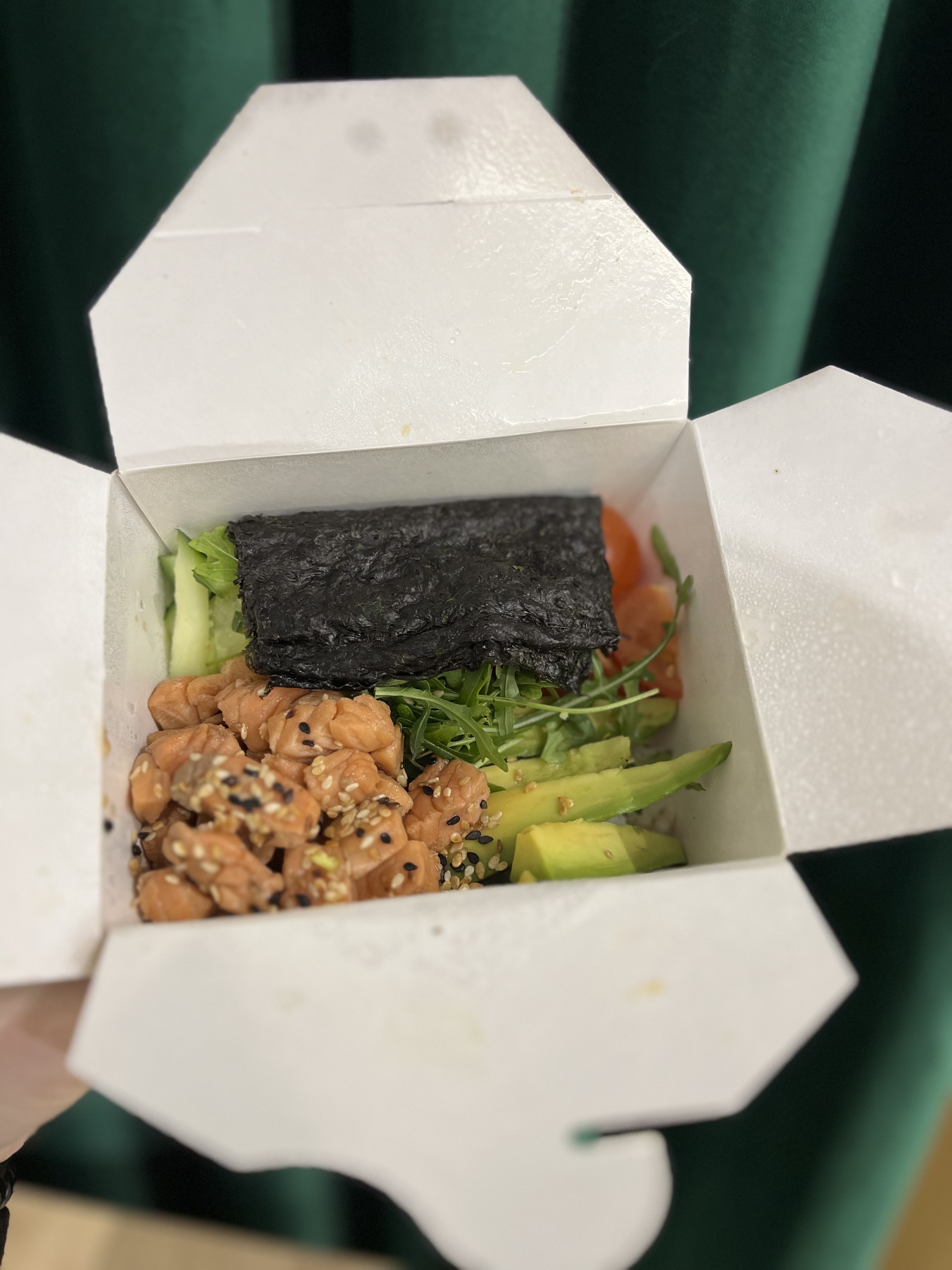 - том кха с цыпленком: бульон, кокосовое молоко, цыпленок, сливки, томаты черри, шампиньоны, лайм, перец чили, кинза, лук перо зеленый, онигири (острое)