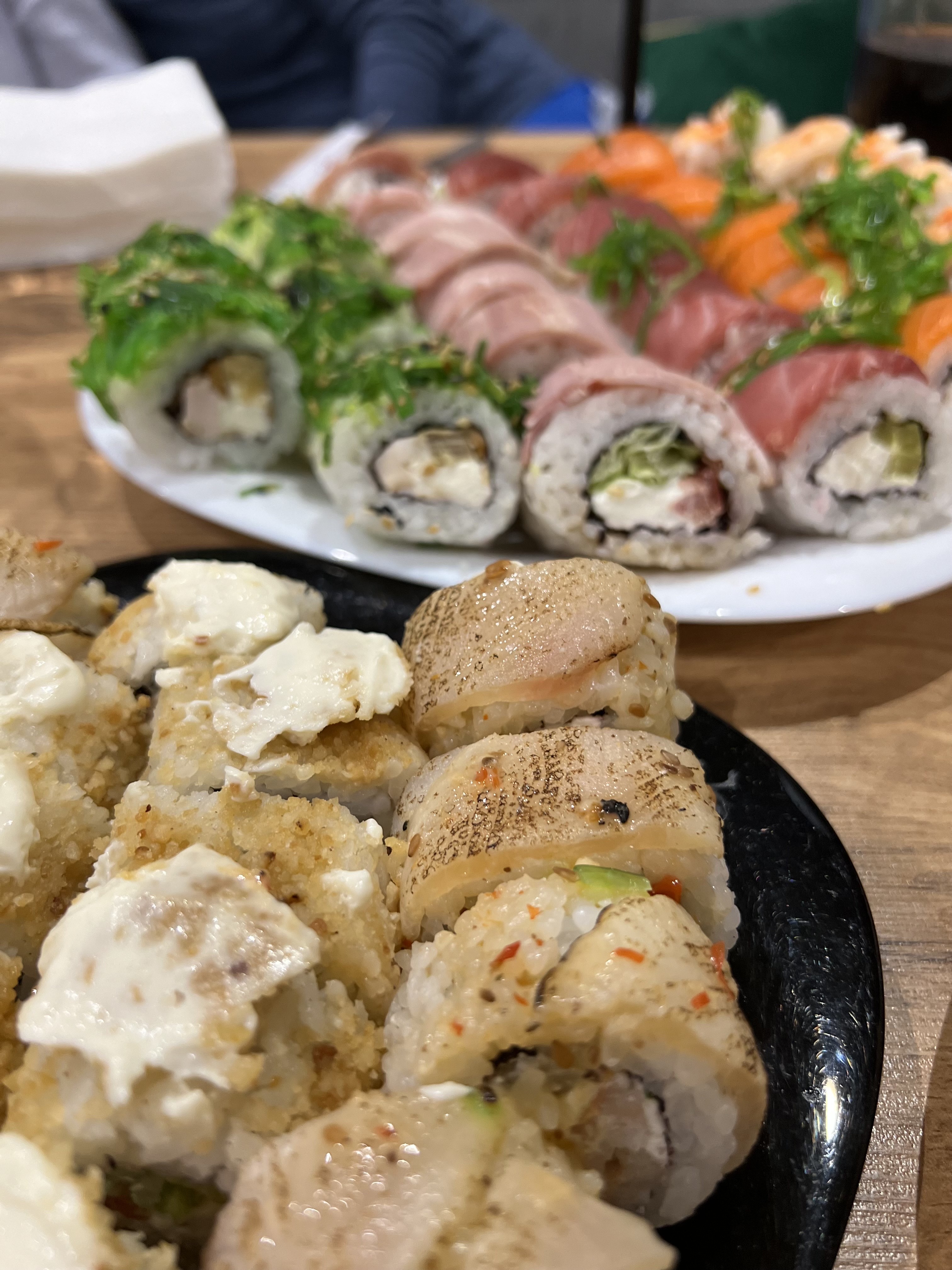 - "Блэк Тай": морской окунь, сливочный сыр, салат айсберг, манго, икра тобико черная, кунжут - 8 шт.