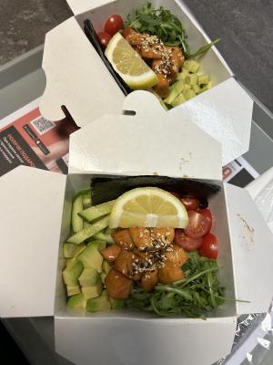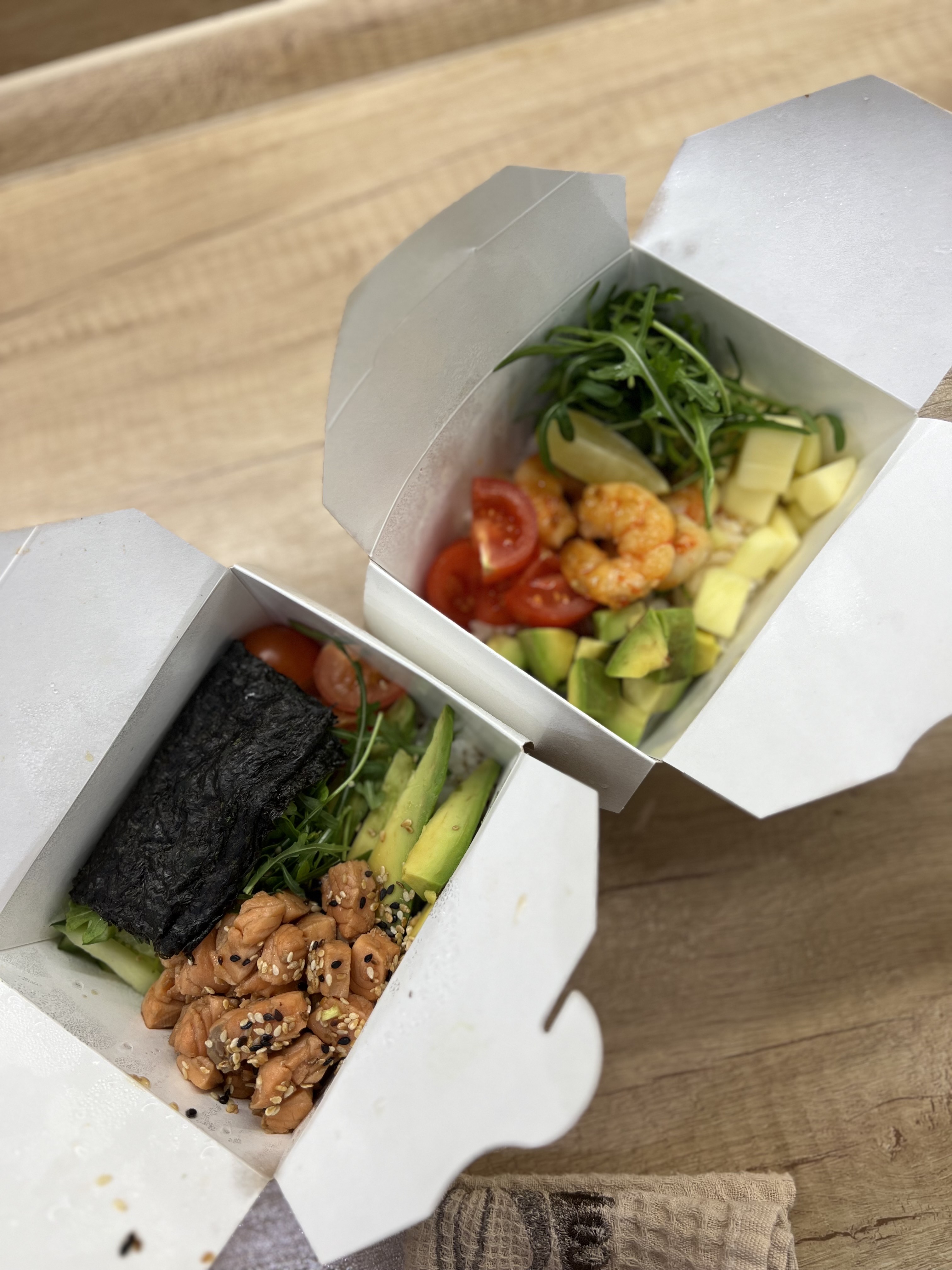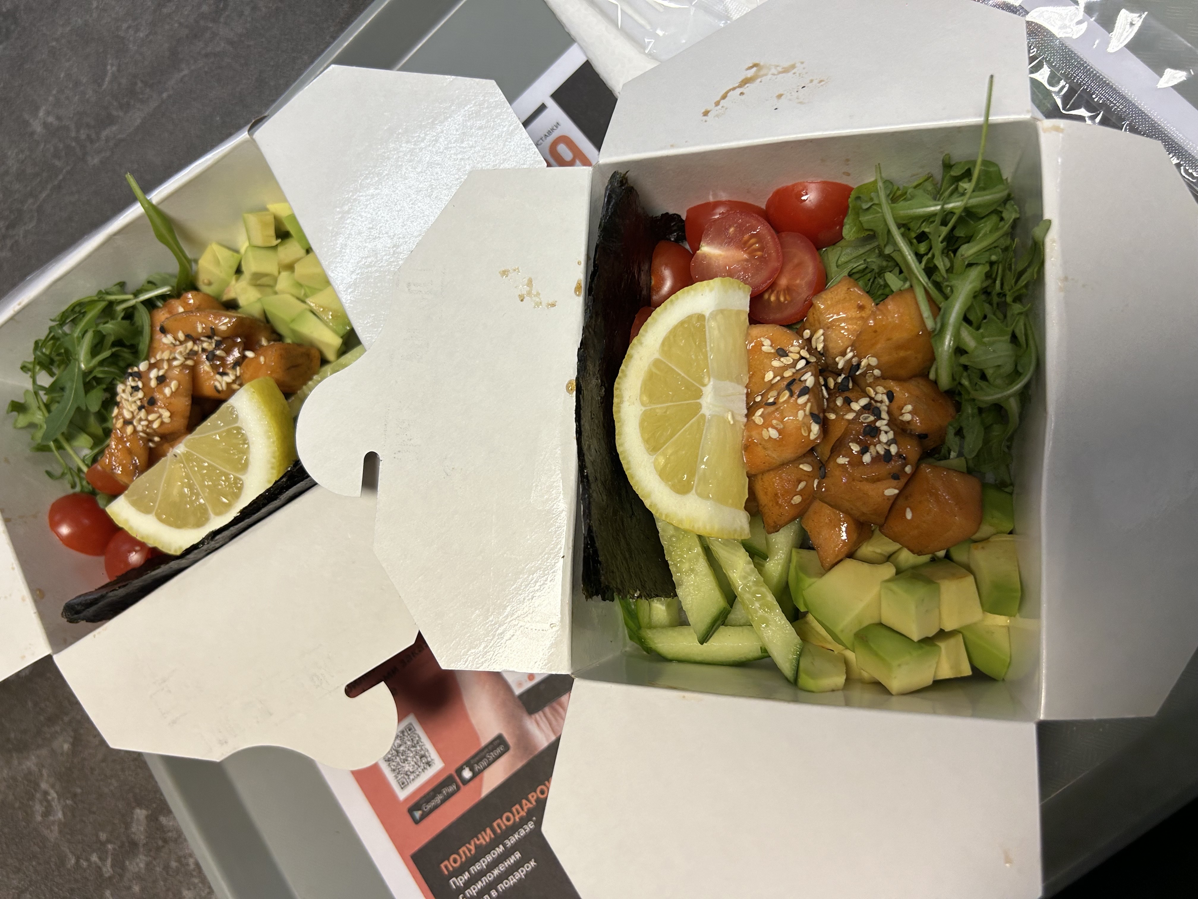 - тяхан со свининой чашу в соусе терияки (размер "М"): японский рис, обжаренный в кунжутном масле с яйцом, соус терияки, свинина чашу, морковь, кунжут, репчатый рук, лук перо зеленый- удон с цыпленком в кисло-сладком соусе (размер "М"): пшеничная лапша в кисло-сладком соусе, цыпленок, пекинская капуста, морковь, спаржевая фасоль, ананас, яйцо, лук перо зеленый, нори