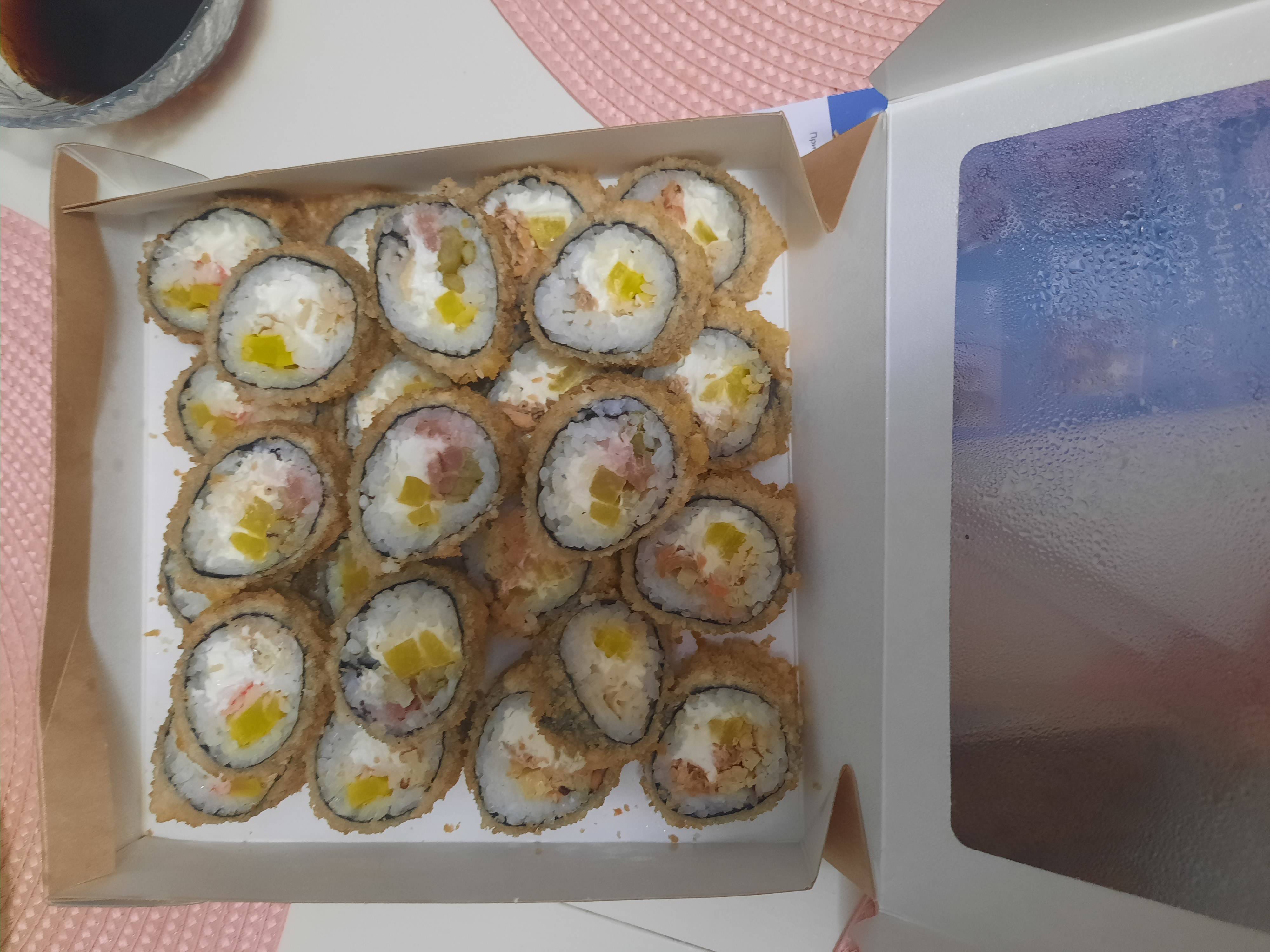 - "Пабло Фрай" (острое): креветка, сливочный сыр, огурец, имбирь маринованный, соус ореховый, панировка - 10 шт.