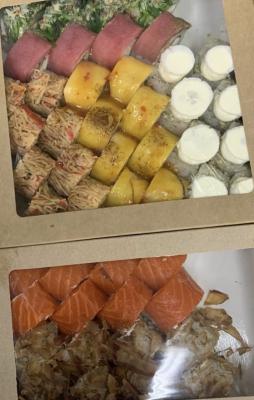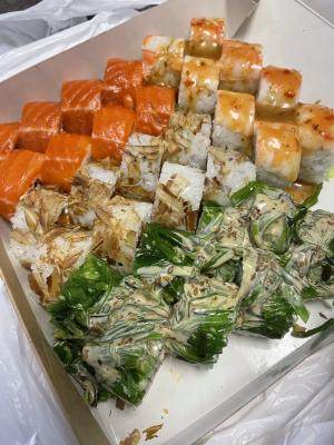 - "Бостон": креветка, сливочный сыр, ананас, салат Айсберг, соус сладко-ореховый, икра Тобико красная. Острое - 8 шт.