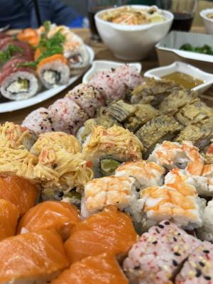 - "Манчестер": жареное филе лосося, такуан, сливочный сыр, омлет тамаго, соус лос-анджелес, кунжут - 8 шт.
