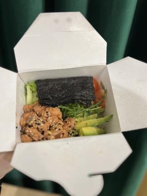 - "Ролл с лососем и манго в кунжуте": филе лосося, сливочный сыр, салат айсберг, манго, кунжут, кешью - 8 шт.