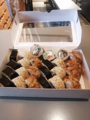 - "Ролл с жаренным окунем и ореховым соусом": жареный окунь, сливочный сыр, огурец, кунжут, соус ореховый - 8 шт.