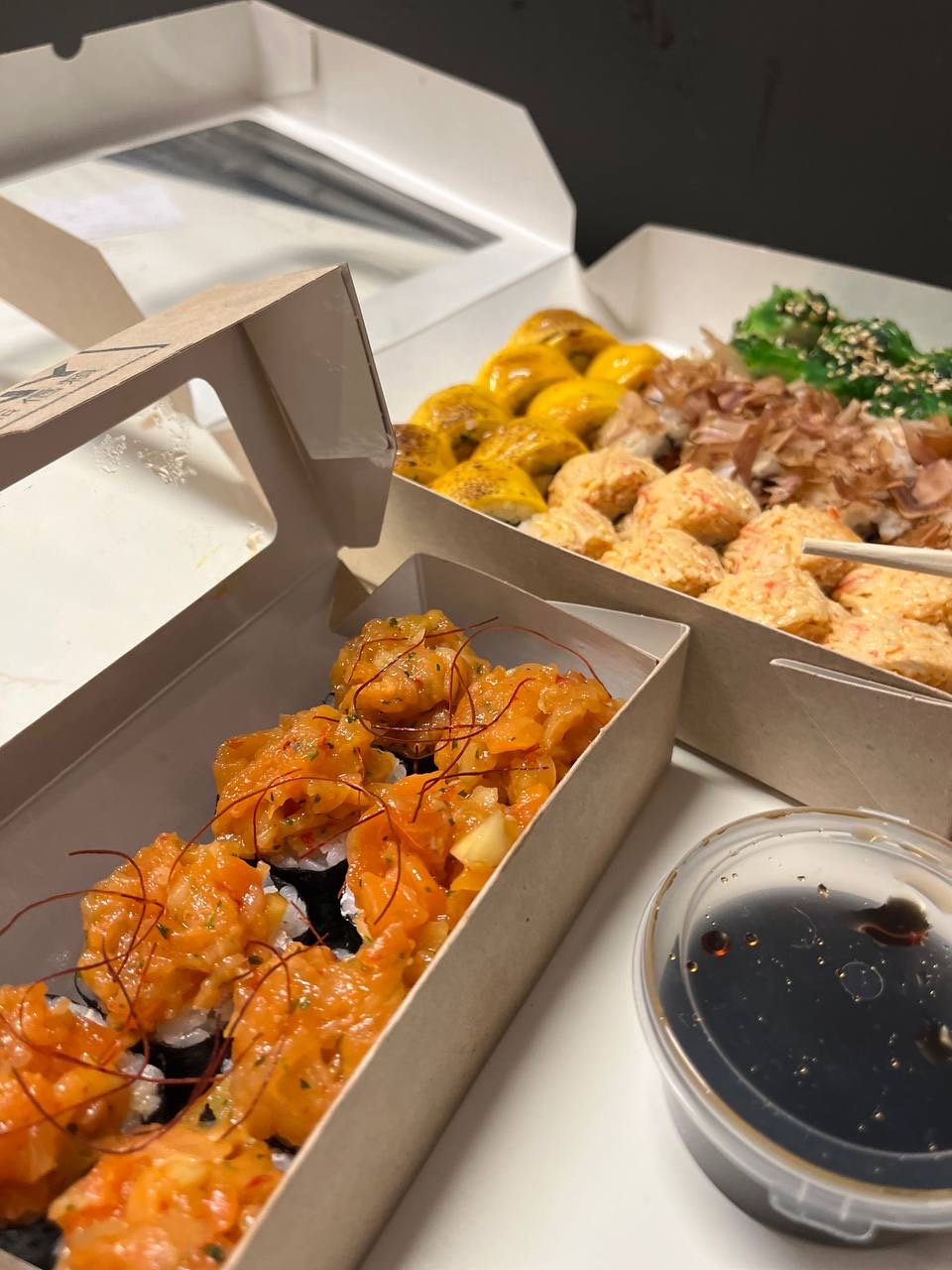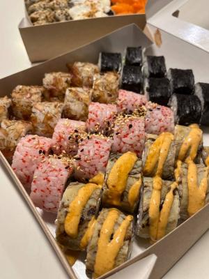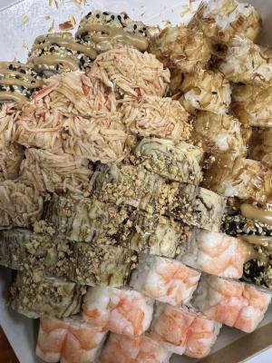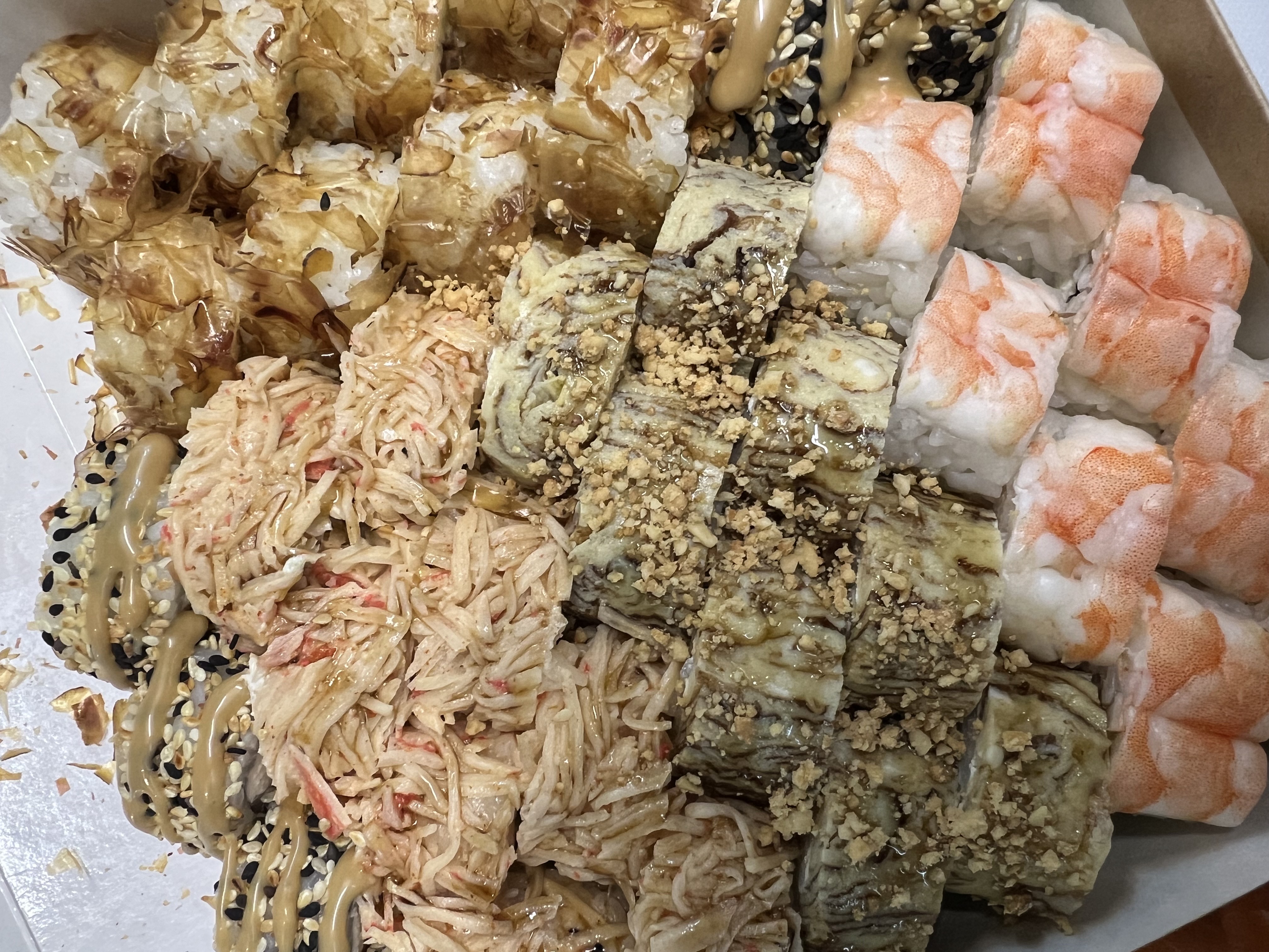- "Бостон": креветка, сливочный сыр, ананас, салат Айсберг, соус сладко-ореховый, икра Тобико красная. Острое - 8 шт.