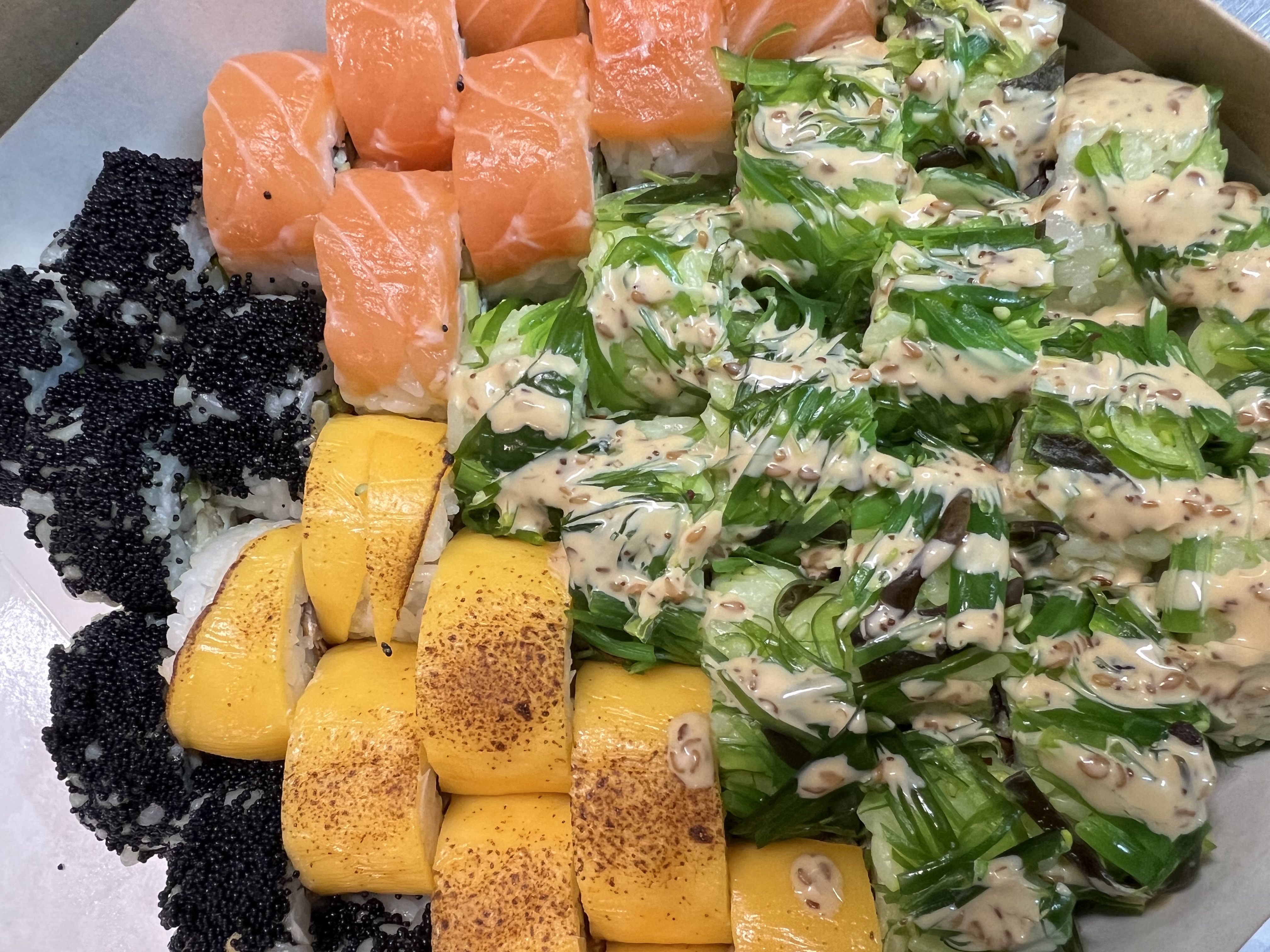 - "Ролл с лососем и манго в кунжуте": филе лосося, сливочный сыр, салат айсберг, манго, кунжут, кешью - 8 шт.