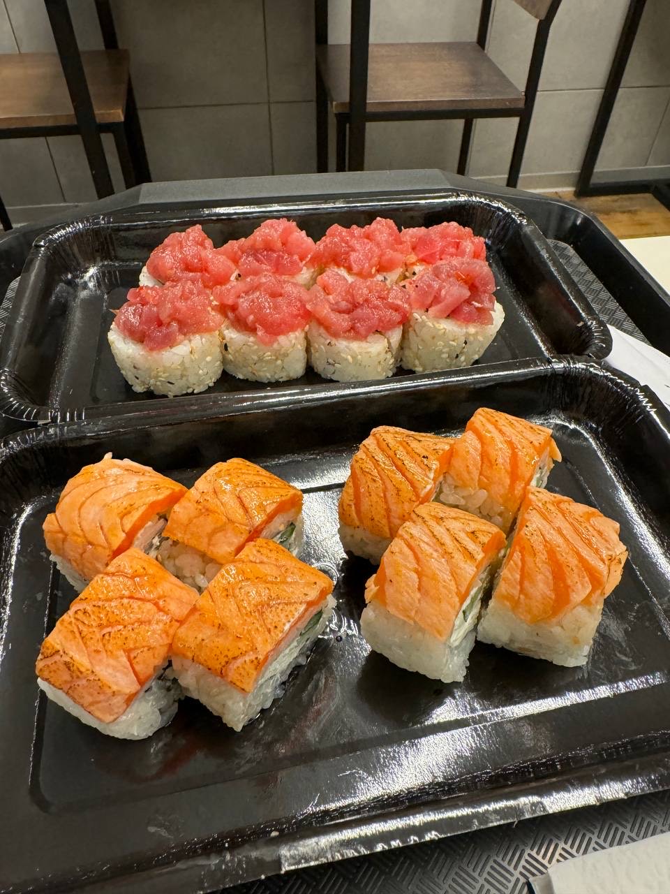 - "Манхеттен": филе лосося, сливочный сыр, авокадо, огурец, кунжут - 8 шт.