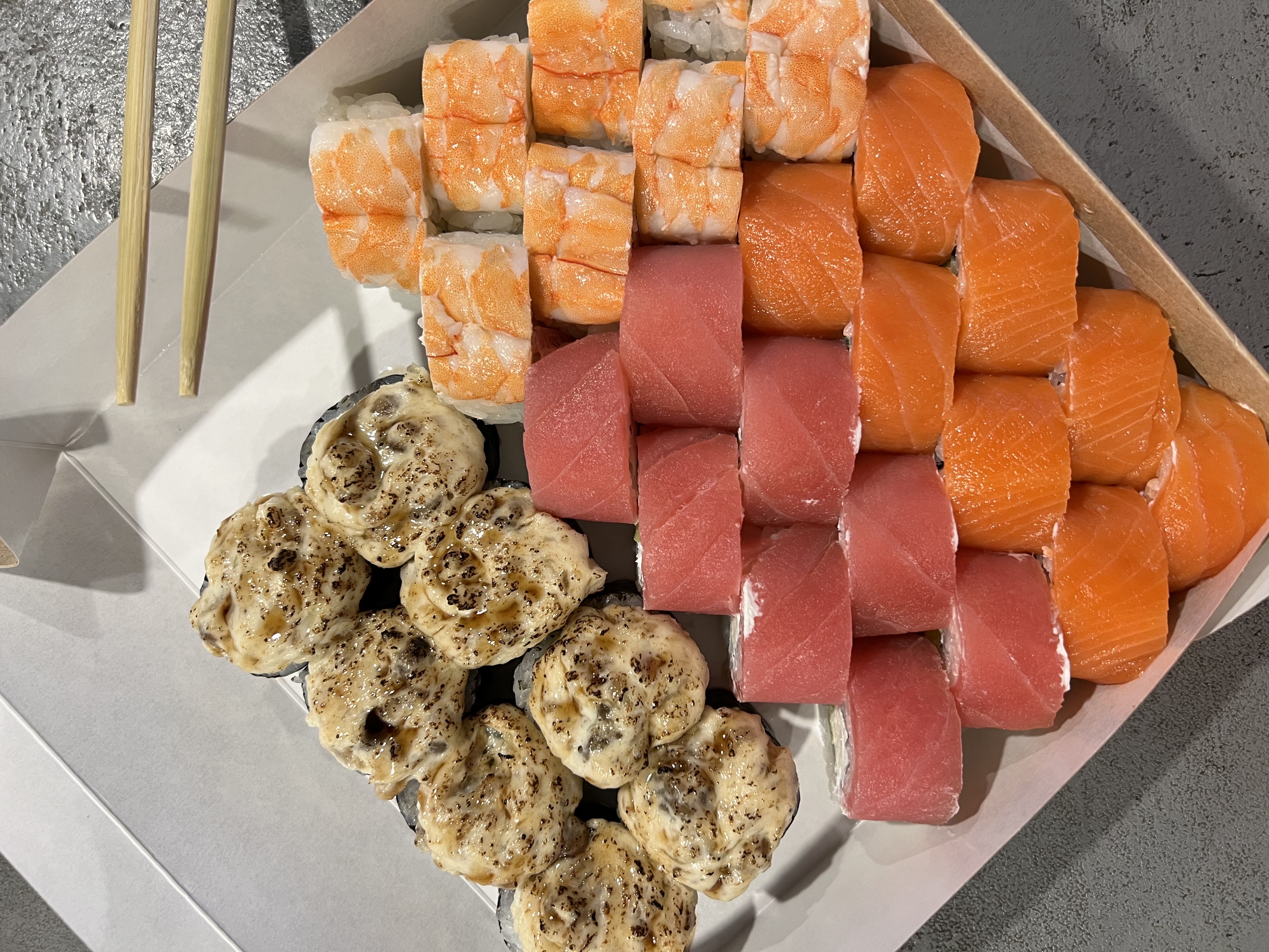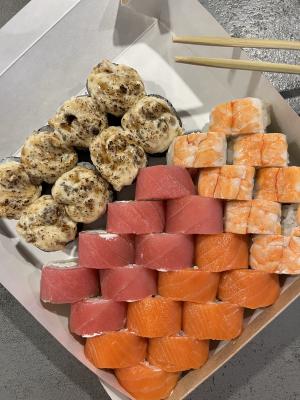 - "Манчестер": жареное филе лосося, такуан, сливочный сыр, омлет тамаго, соус лос-анджелес, кунжут - 8 шт.