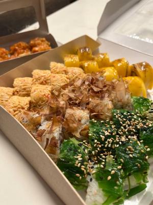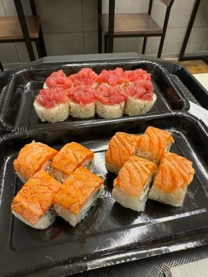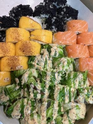 - "Магуро грин": филе тунца, сливочный сыр, салат Айсберг, салат чука, сурими, соус ореховый классик - 8 шт