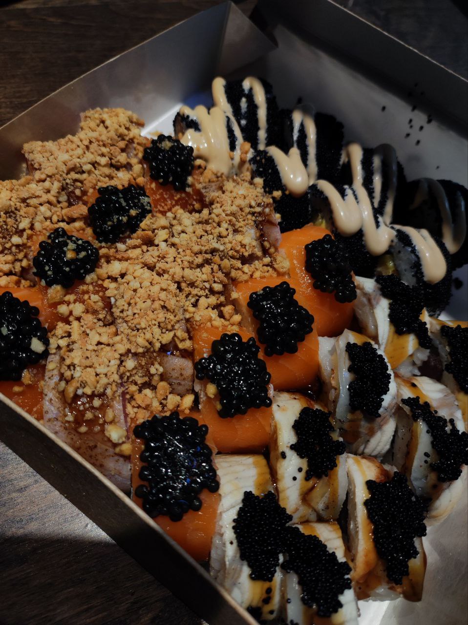 - "Ролл с жаренным окунем и ореховым соусом": жареный окунь, сливочный сыр, огурец, кунжут, соус ореховый - 8 шт.