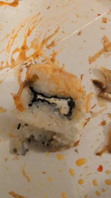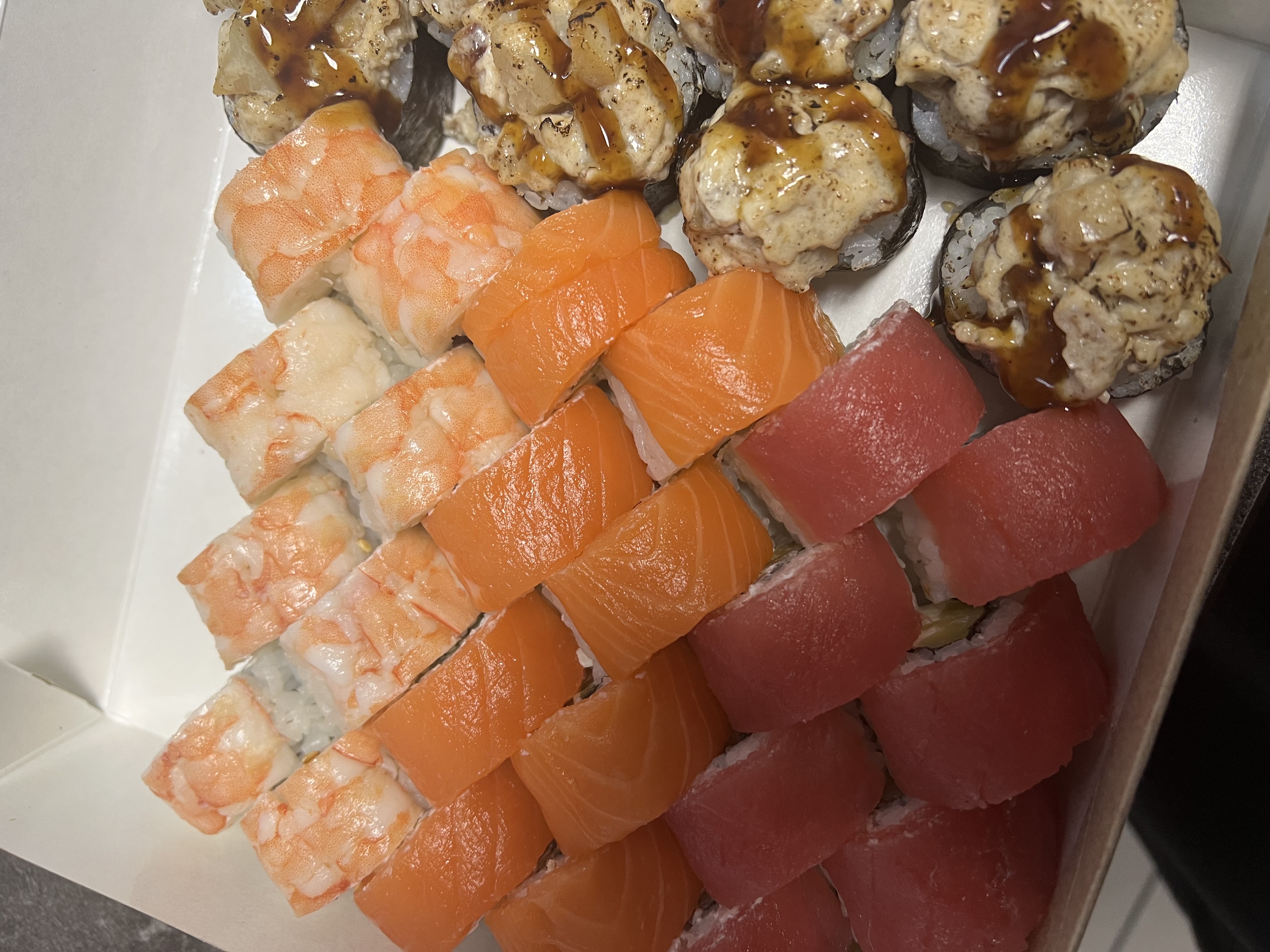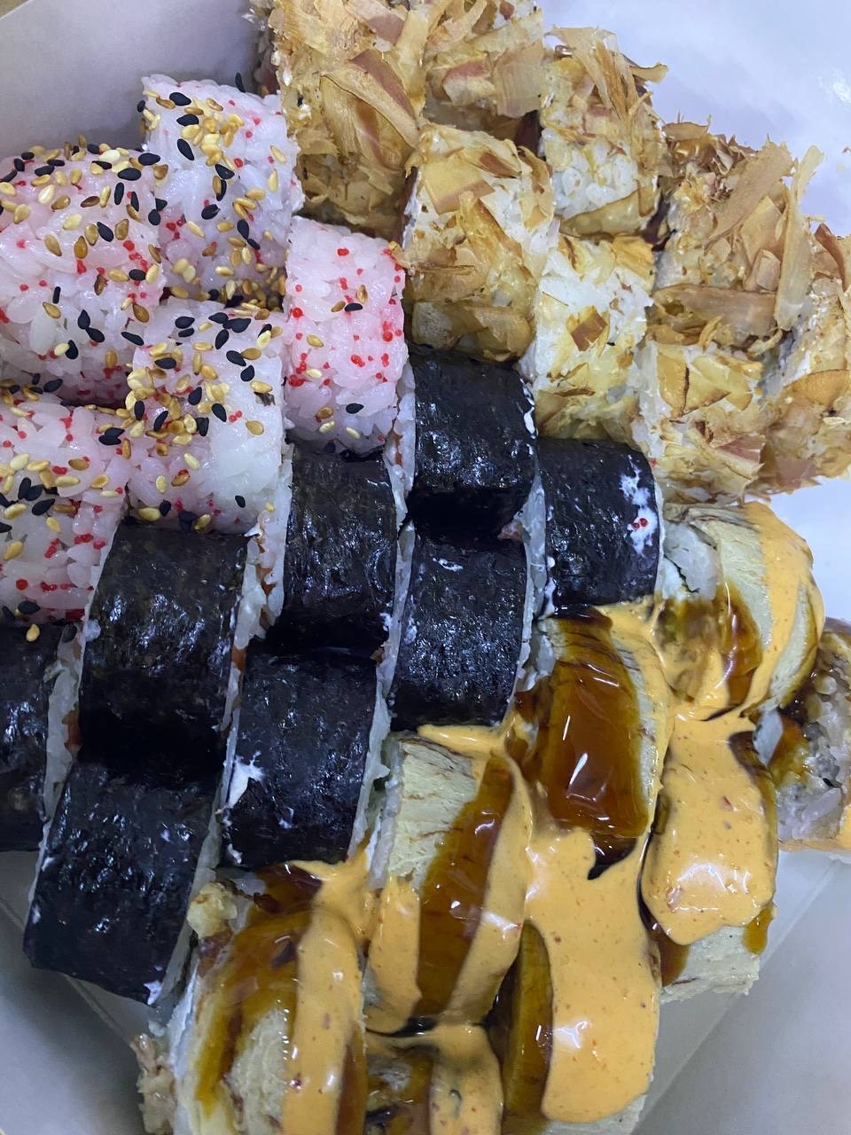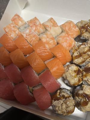 - "Бостон": креветка, сливочный сыр, ананас, салат Айсберг, соус сладко-ореховый, икра Тобико красная. Острое - 8 шт.