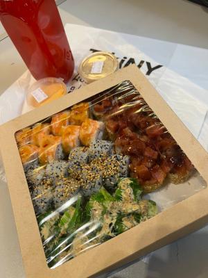 - "Нидзи тунец": филе тунца, сливочный сыр, огурец, такуан, рукола, соус Терияки - 8 шт.