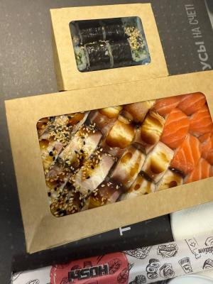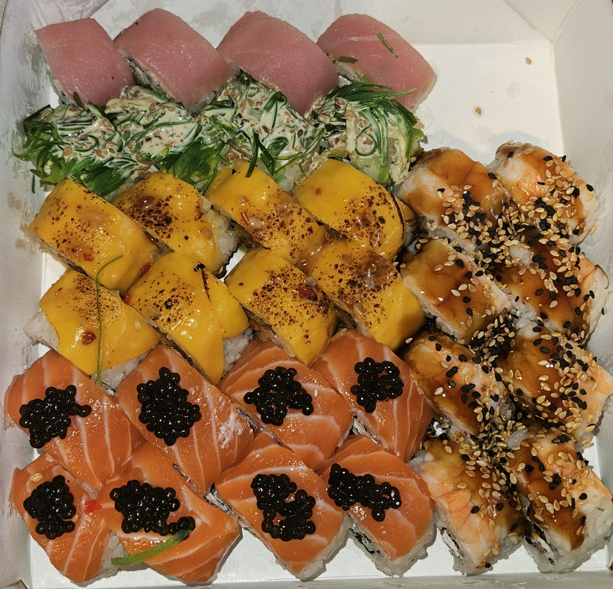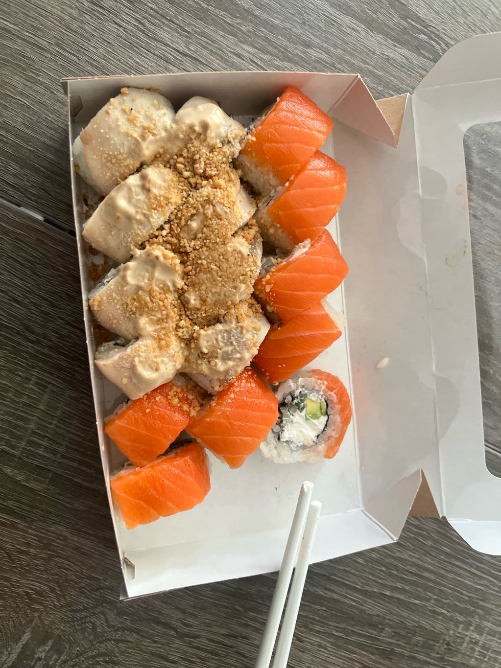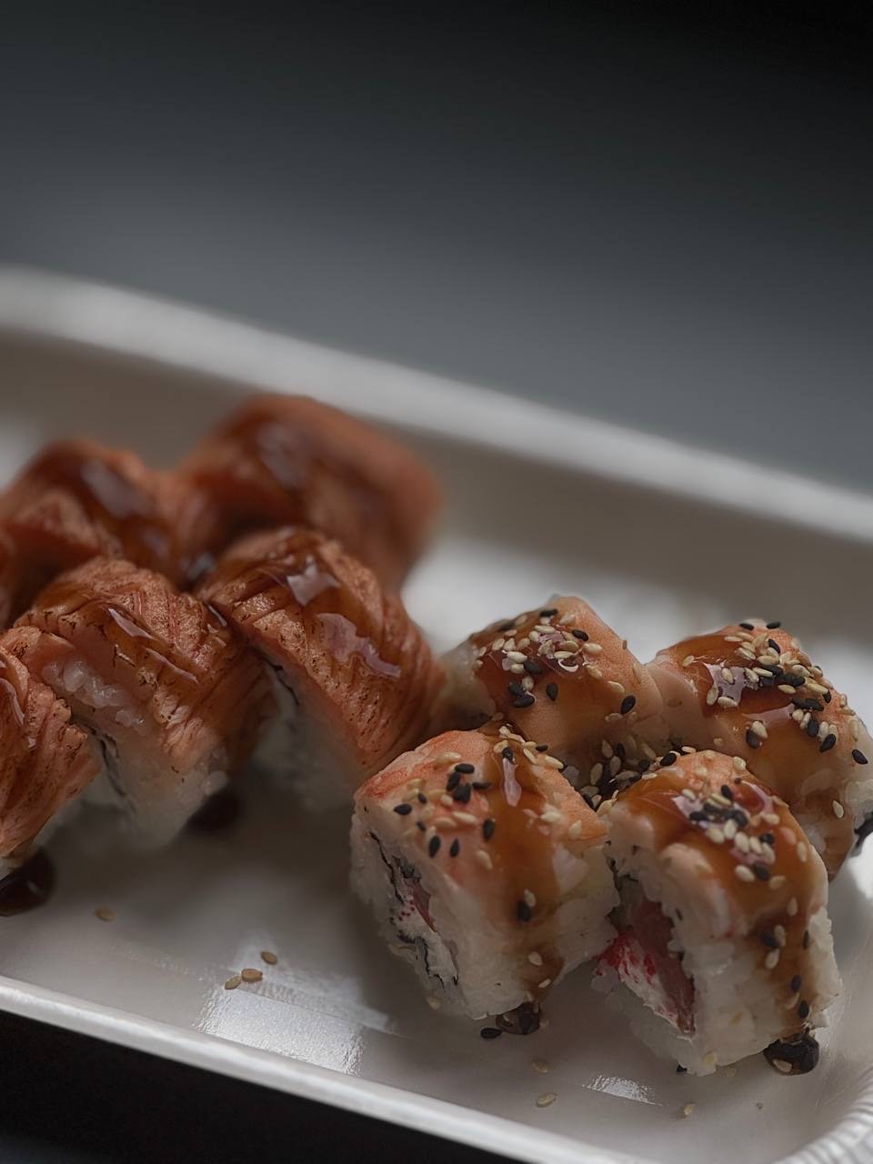 - "Манчестер": жареное филе лосося, такуан, сливочный сыр, омлет тамаго, соус лос-анджелес, кунжут - 8 шт.