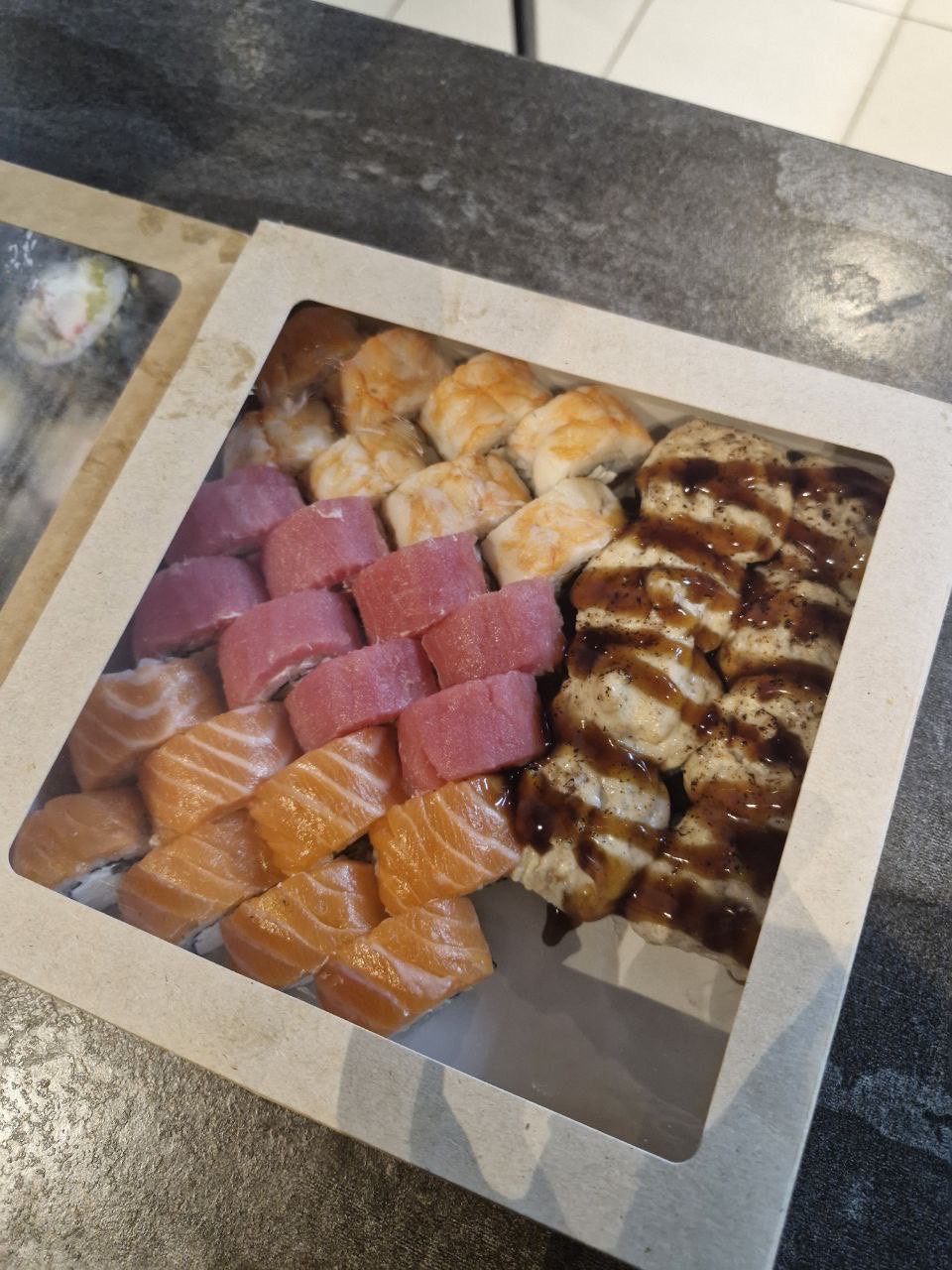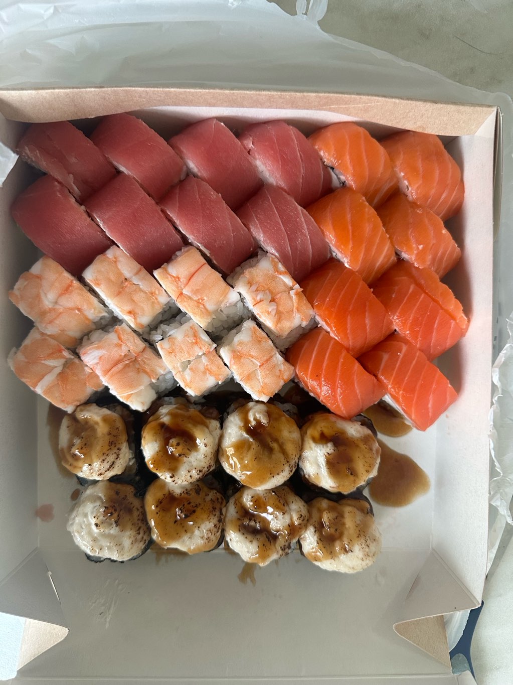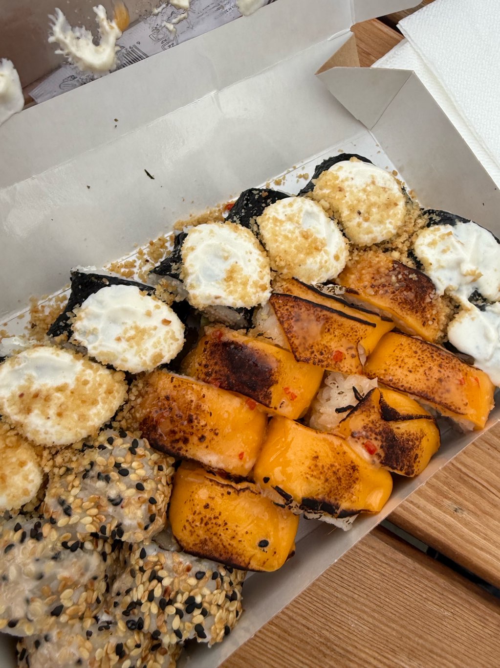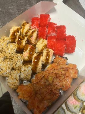 - "Манчестер": жареное филе лосося, такуан, сливочный сыр, омлет тамаго, соус лос-анджелес, кунжут - 8 шт.