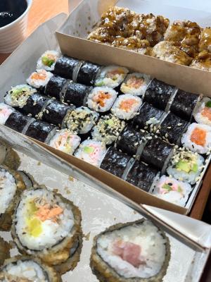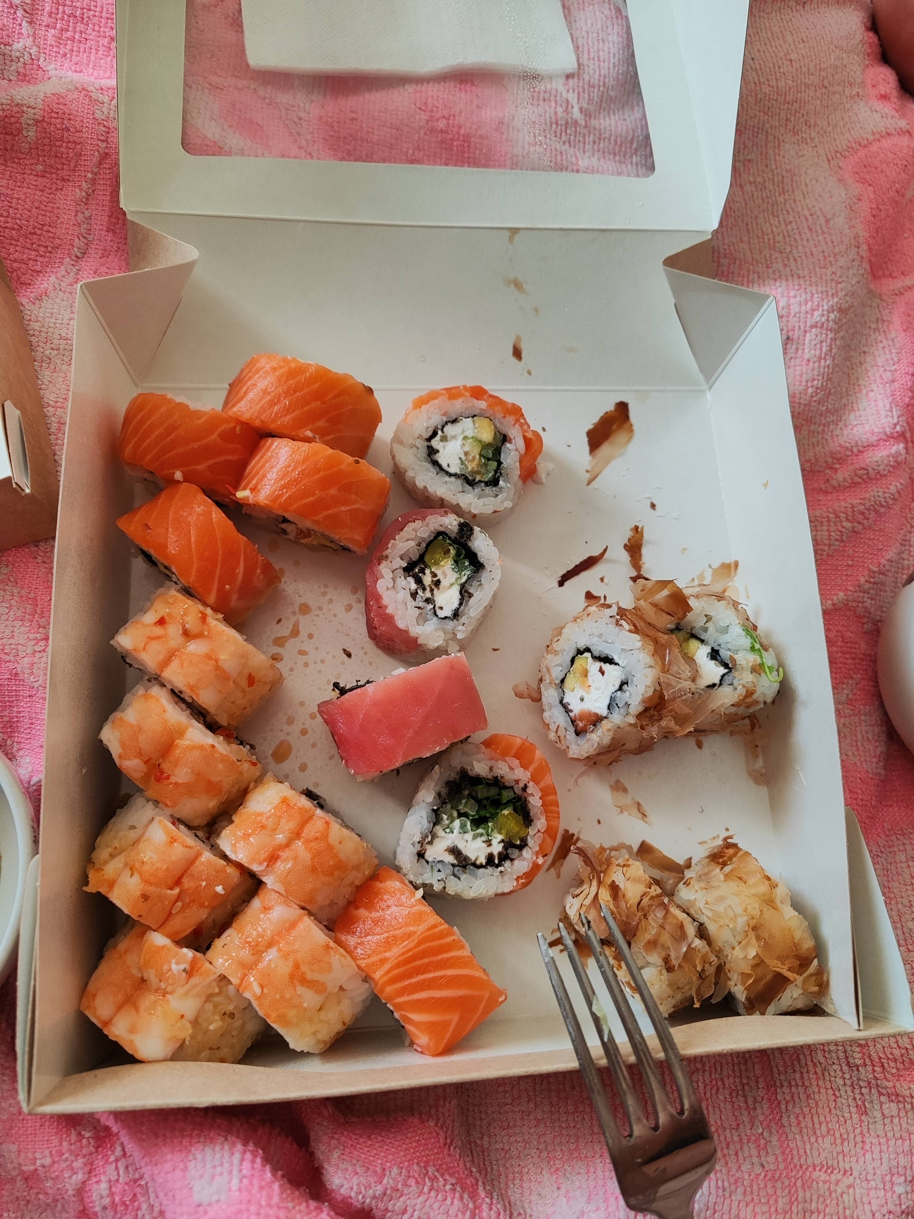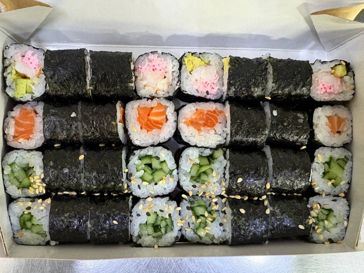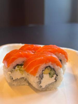 - "Манхеттен": филе лосося, сливочный сыр, авокадо, огурец, кунжут - 8 шт.