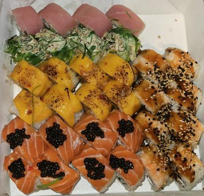- "Ролл с лососем и манго в кунжуте": филе лосося, сливочный сыр, салат айсберг, манго, кунжут, кешью - 8 шт.