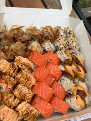 - "Чарлстон": филе лосося, сливочный сыр, филе тунца, лук жареный, огурец - 8 шт.