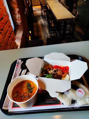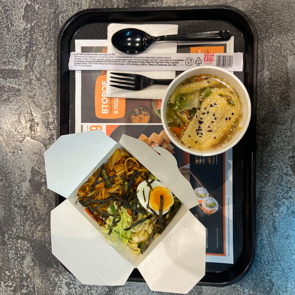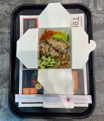 - тяхан со свининой чашу в соусе терияки (размер "М"): японский рис, обжаренный в кунжутном масле с яйцом, соус терияки, свинина чашу, морковь, кунжут, репчатый рук, лук перо зеленый- удон с цыпленком в кисло-сладком соусе (размер "М"): пшеничная лапша в кисло-сладком соусе, цыпленок, пекинская капуста, морковь, спаржевая фасоль, ананас, яйцо, лук перо зеленый, нори