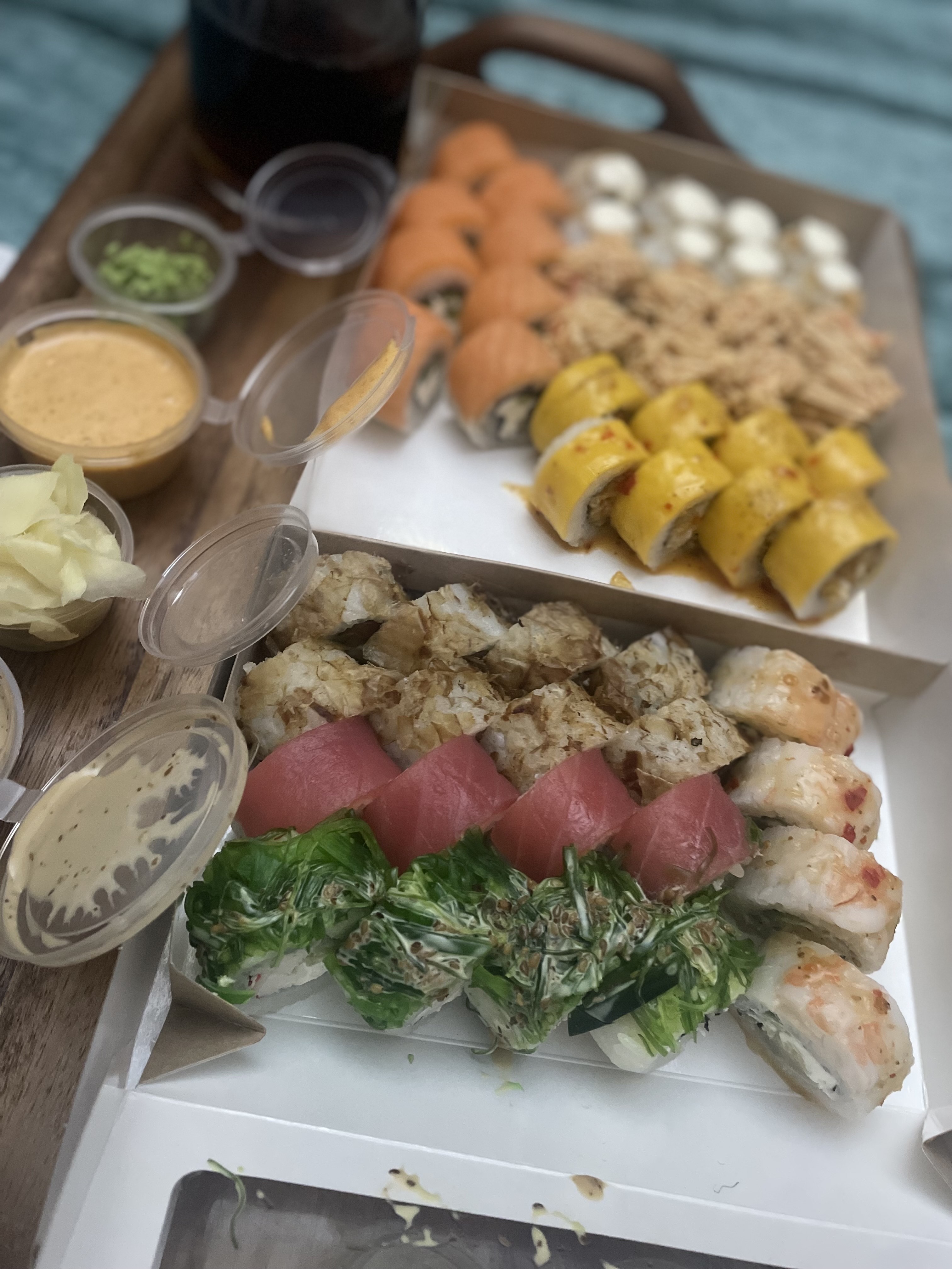 - "Дентон": бекон, овощи-гриль, сливочный сыр, омлет тамаго, соус терияки и соус спайси - 8 шт.
