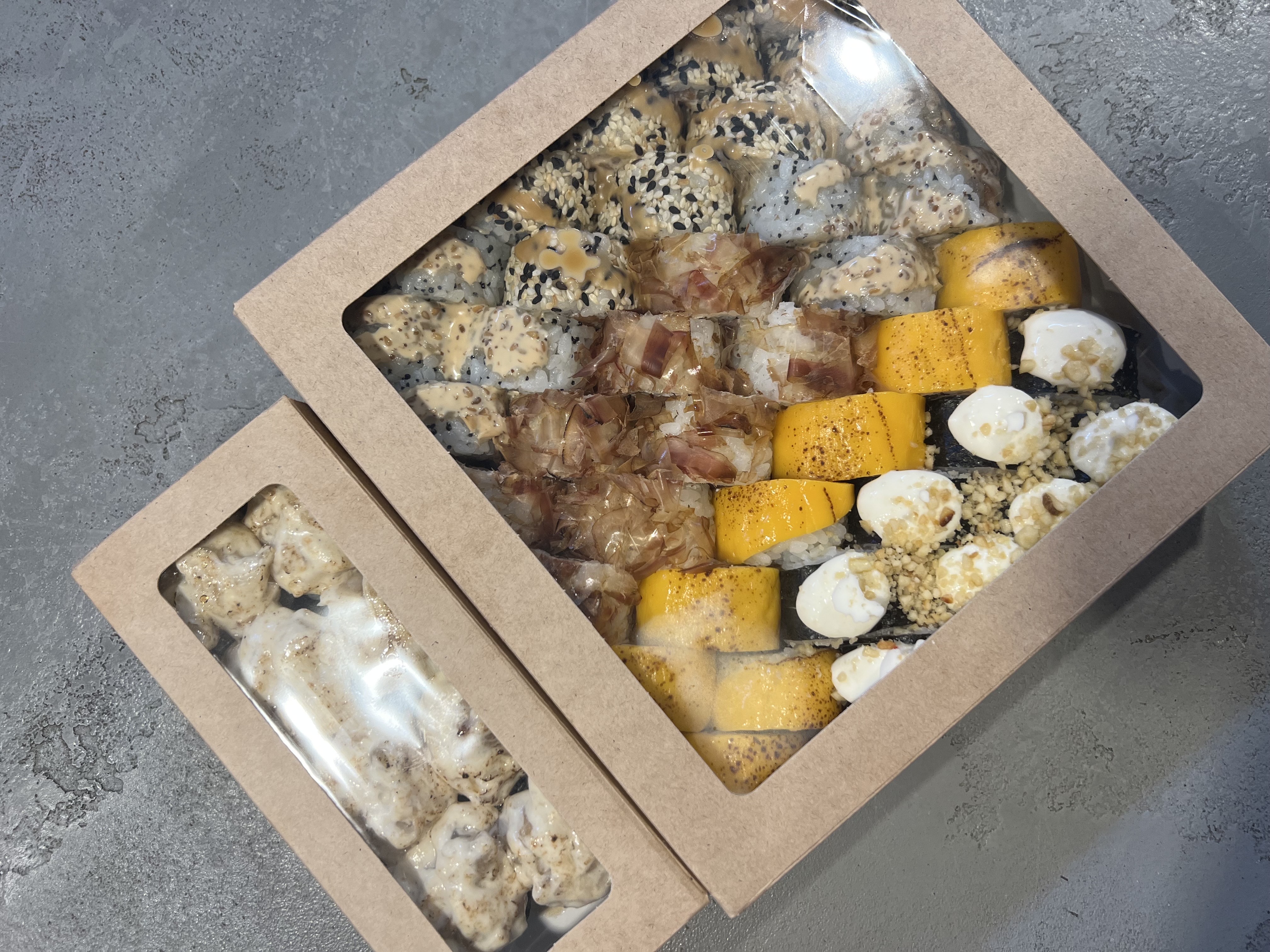 - "Инаги": жареный морской окунь, сливочный сыр, огурец, омлет тамаго, сырный соус, соус терияки, соус пряный - 8 шт.