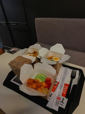 - фунчоза с тигровыми креветками (размер "М"): рисовая лапша в кисло-сладком соусе, креветка, пекинская капуста, морковь, спаржевая фасоль, сладкий перец, ананас, яйцо, кунжут, лук-порей, арахис