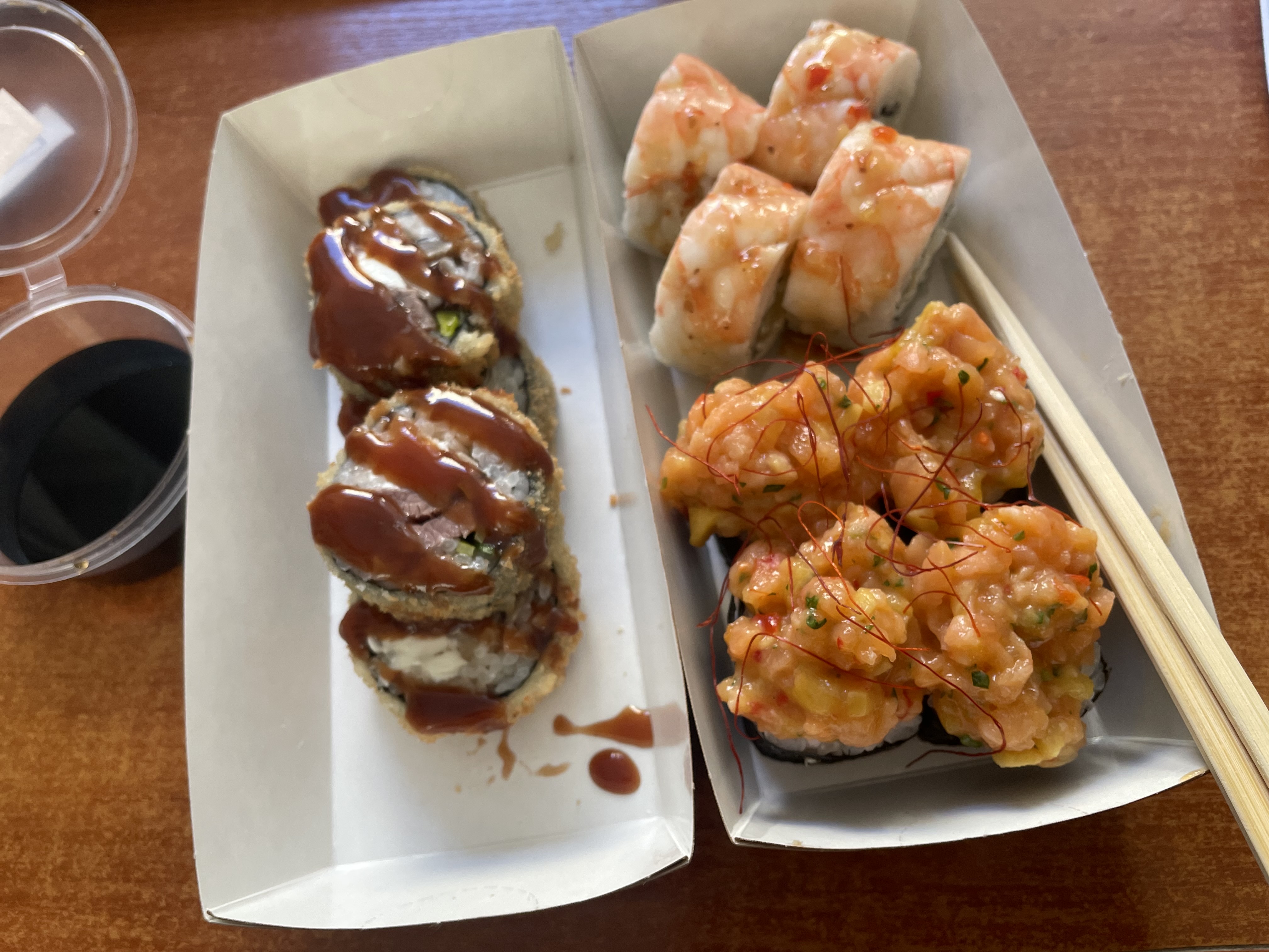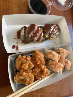 - "Бостон": креветка, сливочный сыр, ананас, салат Айсберг, соус сладко-ореховый, икра Тобико красная. Острое - 8 шт.