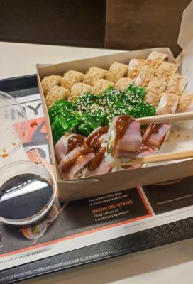 - "Дентон": бекон, овощи-гриль, сливочный сыр, омлет тамаго, соус терияки и соус спайси - 8 шт.