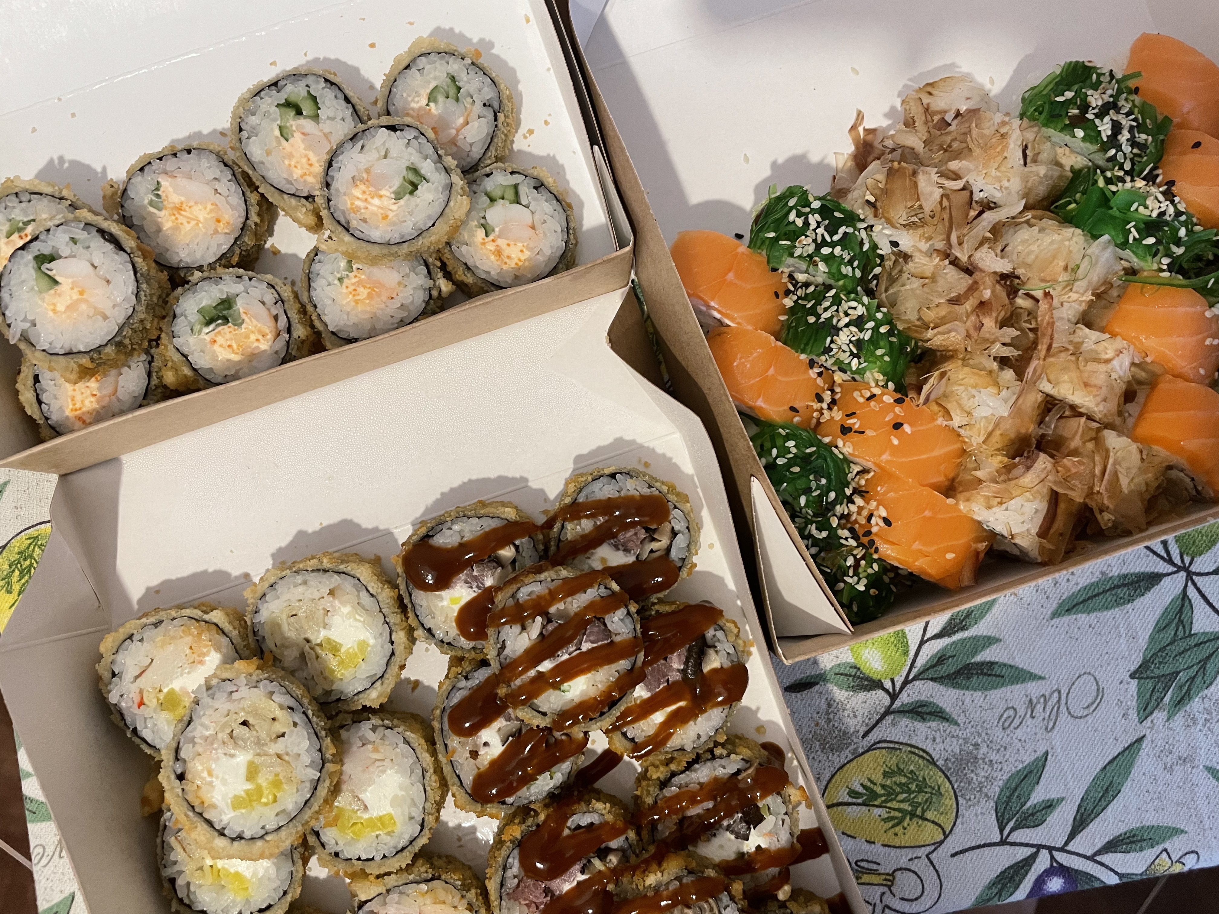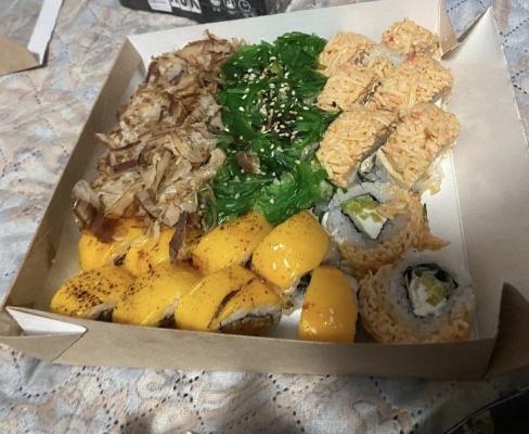 - "Манчестер": жареное филе лосося, такуан, сливочный сыр, омлет тамаго, соус лос-анджелес, кунжут - 8 шт.