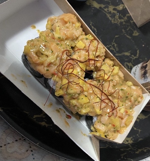 - "Ролл с лососем и манго в кунжуте": филе лосося, сливочный сыр, салат айсберг, манго, кунжут, кешью - 8 шт.