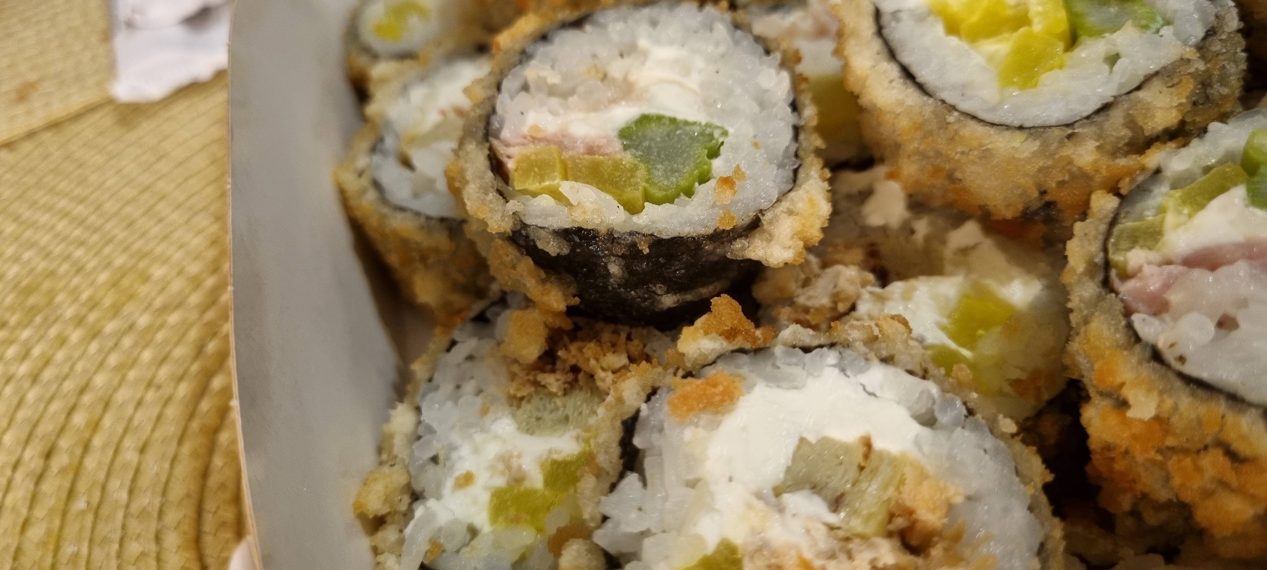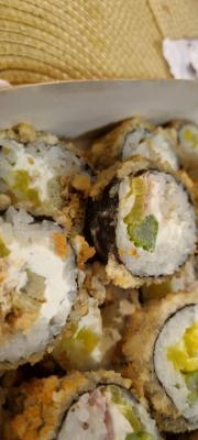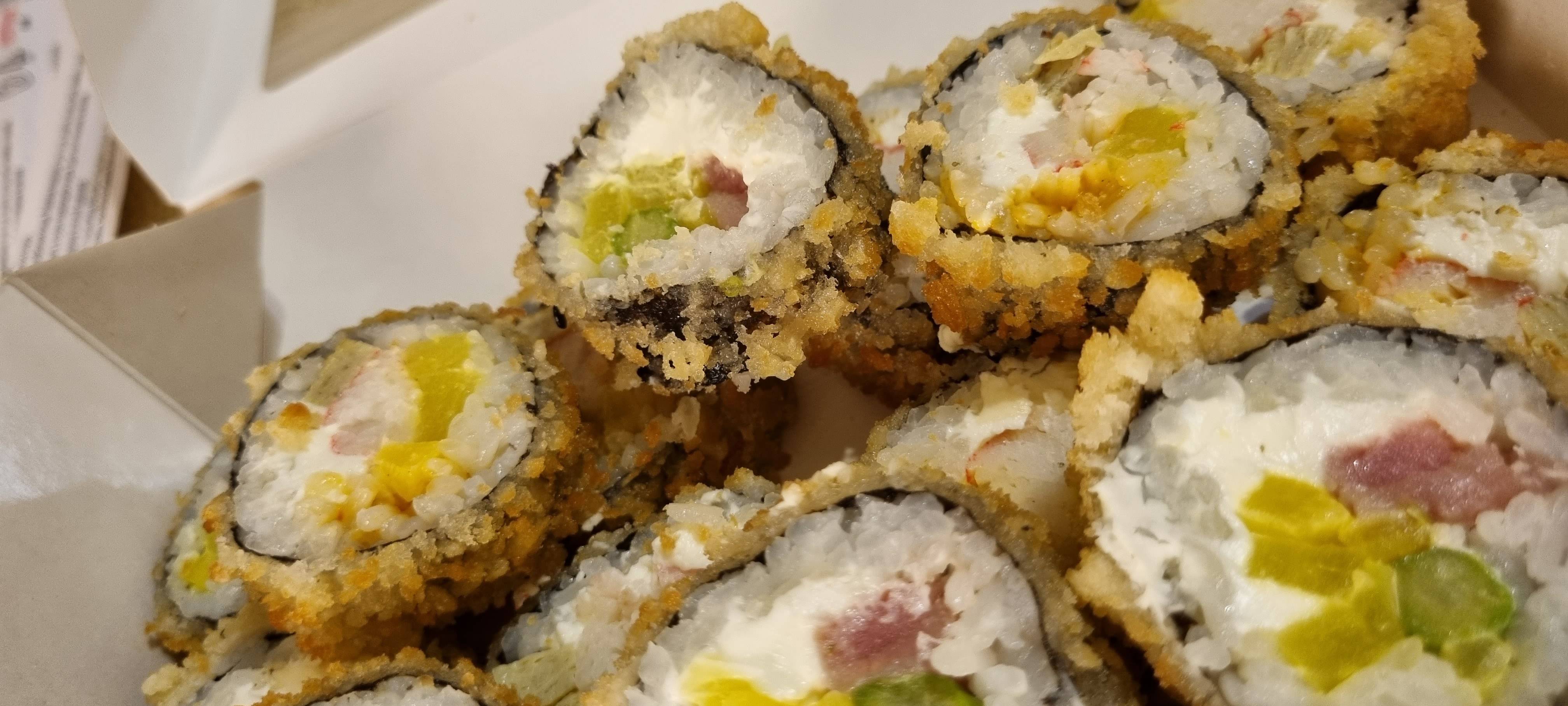 - "Пабло Фрай" (острое): креветка, сливочный сыр, огурец, имбирь маринованный, соус ореховый, панировка - 10 шт.
