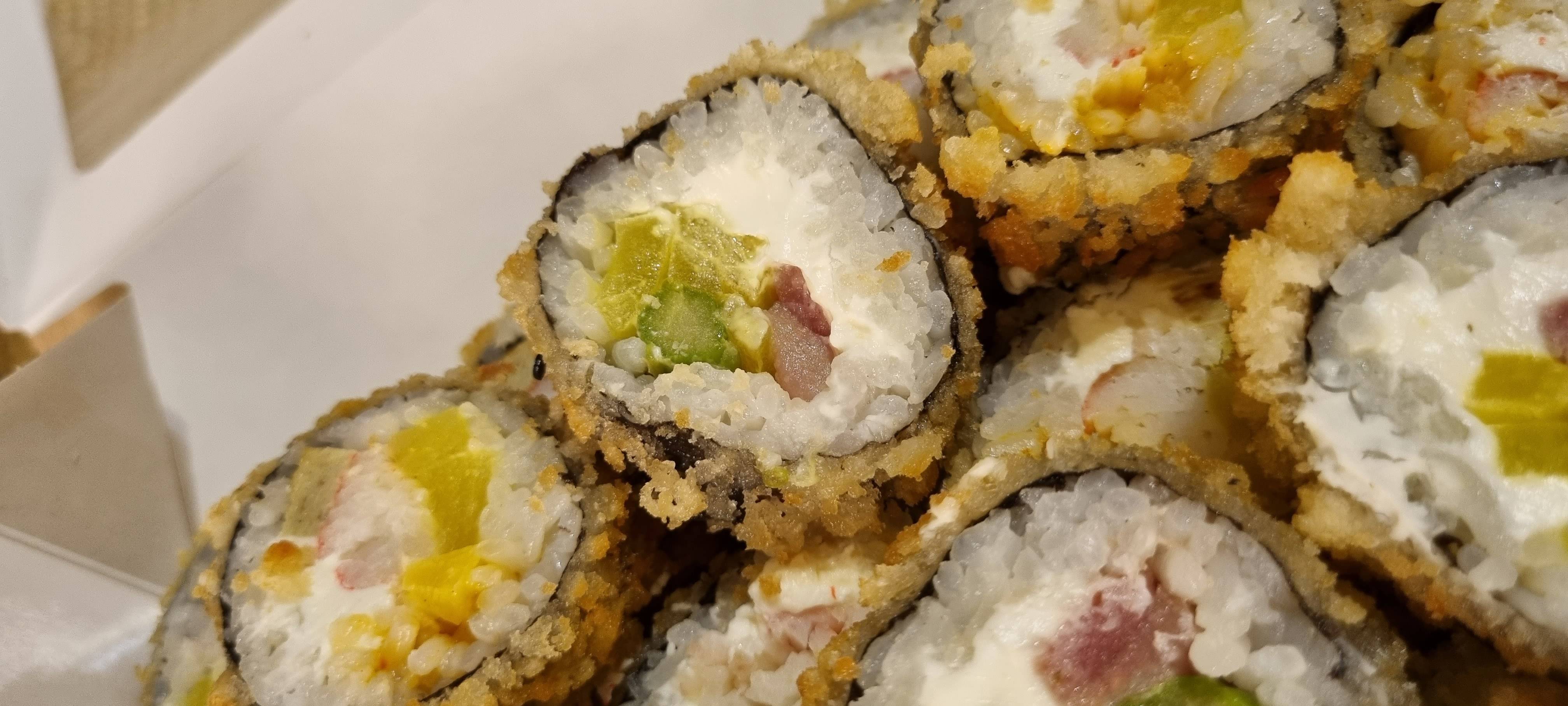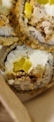 - "Аризона фрай": филе лосося, сливочный сыр, огурец, такуан, панировка - 5 шт.