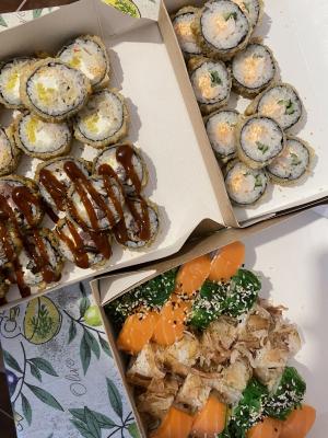 - "Магуро грин": филе тунца, сливочный сыр, салат Айсберг, салат чука, сурими, соус ореховый классик - 8 шт