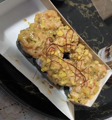 - "Висконсин🌶": креветка, сыр чеддер, пряный соус, соус сладко-ореховый, криспи - 8 шт.