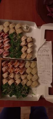 - "Дентон": бекон, овощи-гриль, сливочный сыр, омлет тамаго, соус терияки и соус спайси - 8 шт.