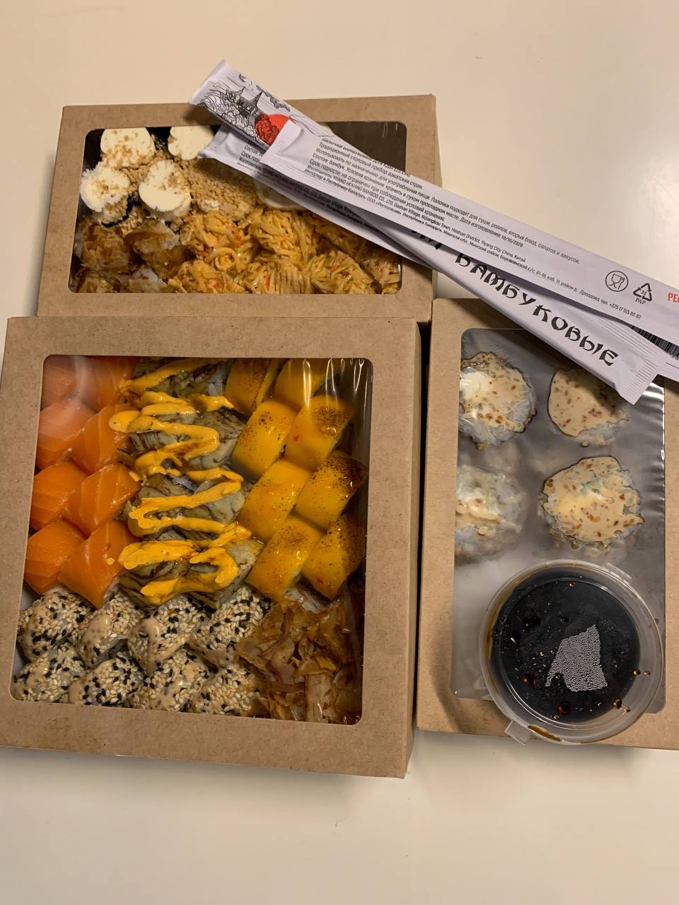 - тяхан со свининой чашу в соусе терияки (размер "М"): японский рис, обжаренный в кунжутном масле с яйцом, соус терияки, свинина чашу, морковь, кунжут, репчатый рук, лук перо зеленый- удон с цыпленком в кисло-сладком соусе (размер "М"): пшеничная лапша в кисло-сладком соусе, цыпленок, пекинская капуста, морковь, спаржевая фасоль, ананас, яйцо, лук перо зеленый, нори