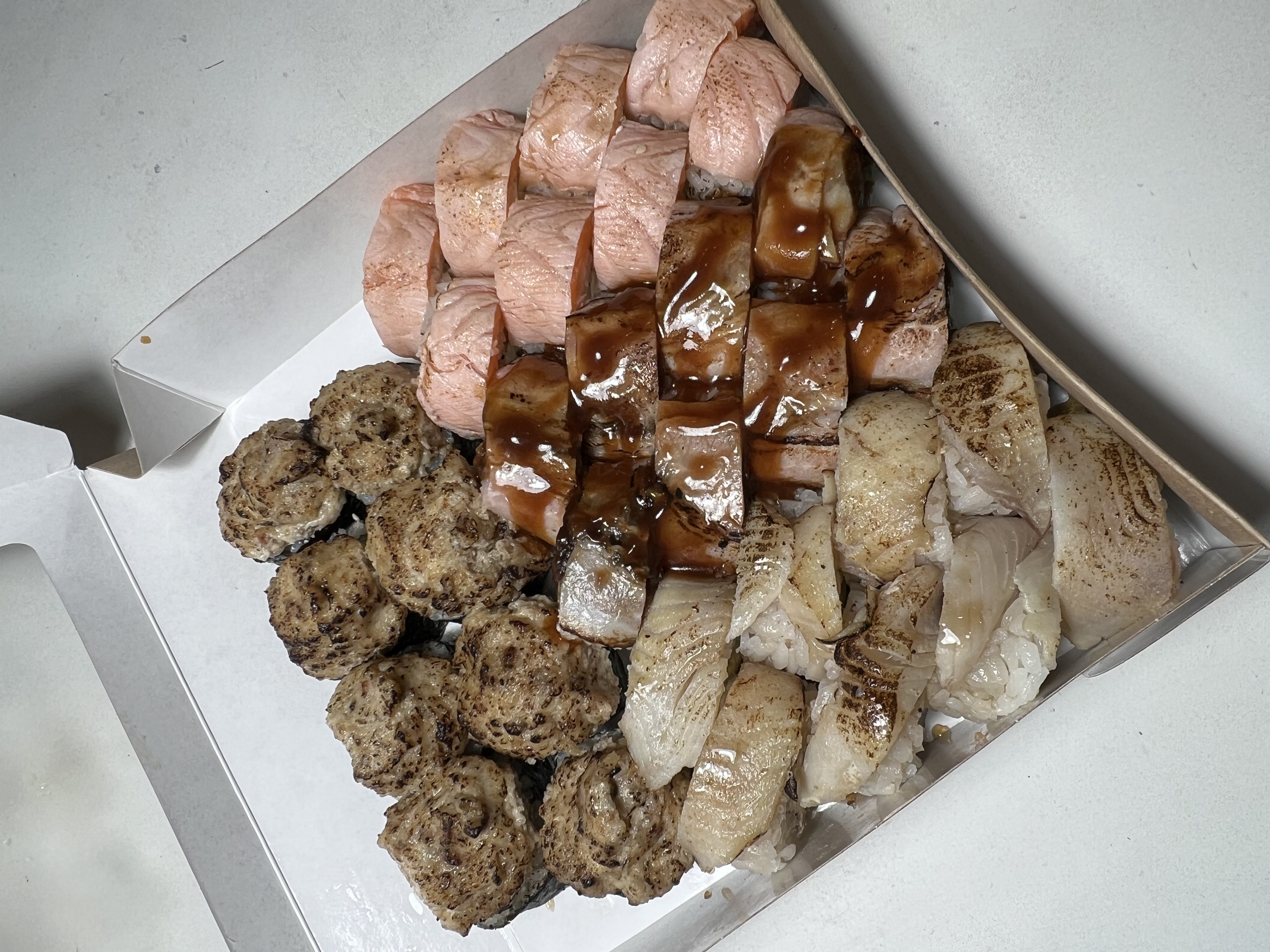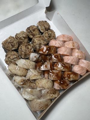 - "Манчестер": жареное филе лосося, такуан, сливочный сыр, омлет тамаго, соус лос-анджелес, кунжут - 8 шт.