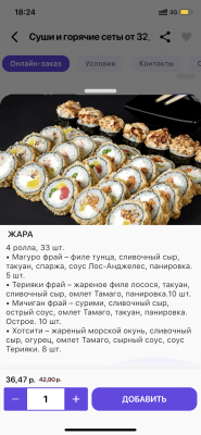 - "Инаги": жареный морской окунь, сливочный сыр, огурец, омлет тамаго, сырный соус, соус терияки, соус пряный - 8 шт.
