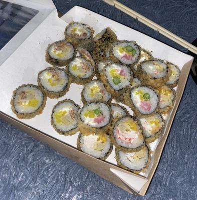 - "Аризона фрай": филе лосося, сливочный сыр, огурец, такуан, панировка - 5 шт.