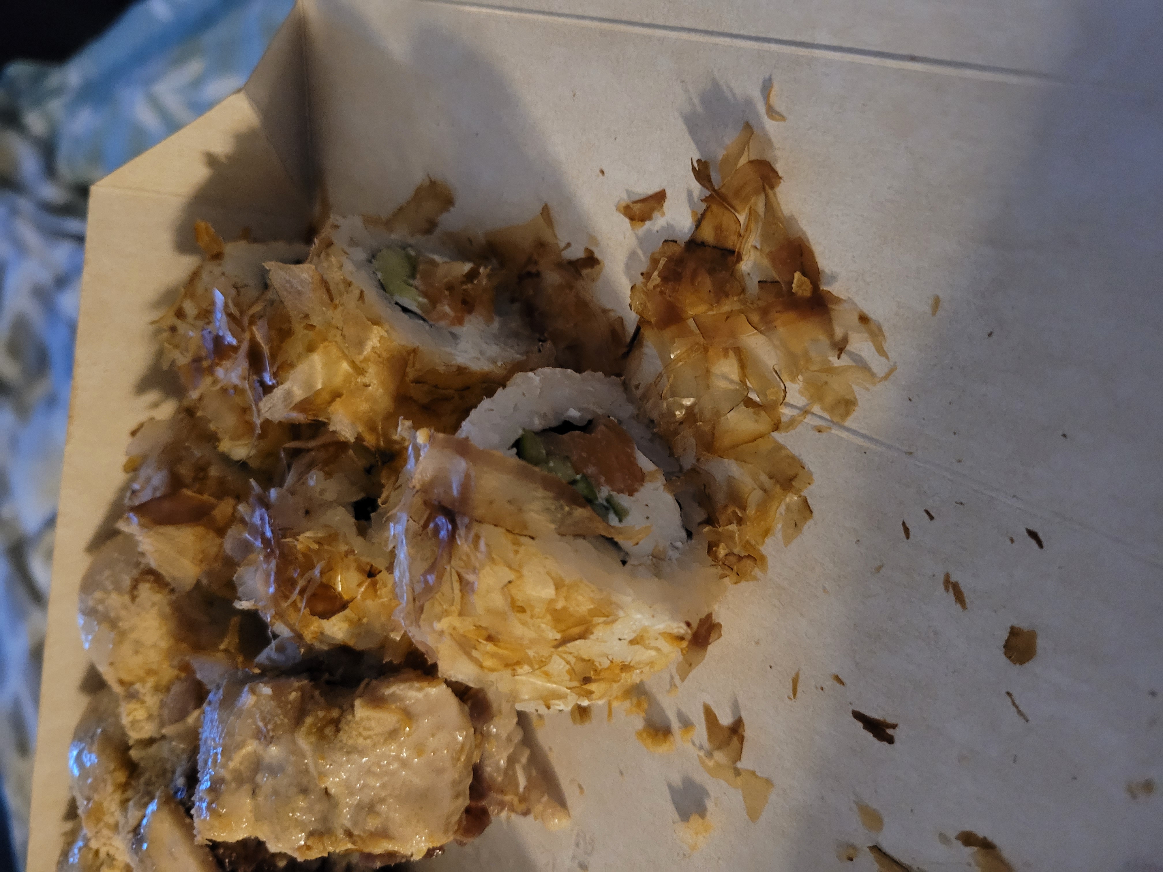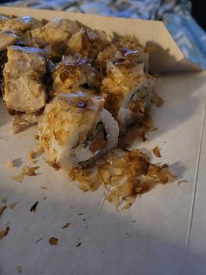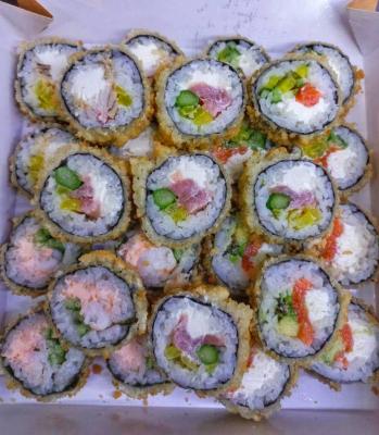 - "Аризона фрай": филе лосося, сливочный сыр, огурец, такуан, панировка - 5 шт.
