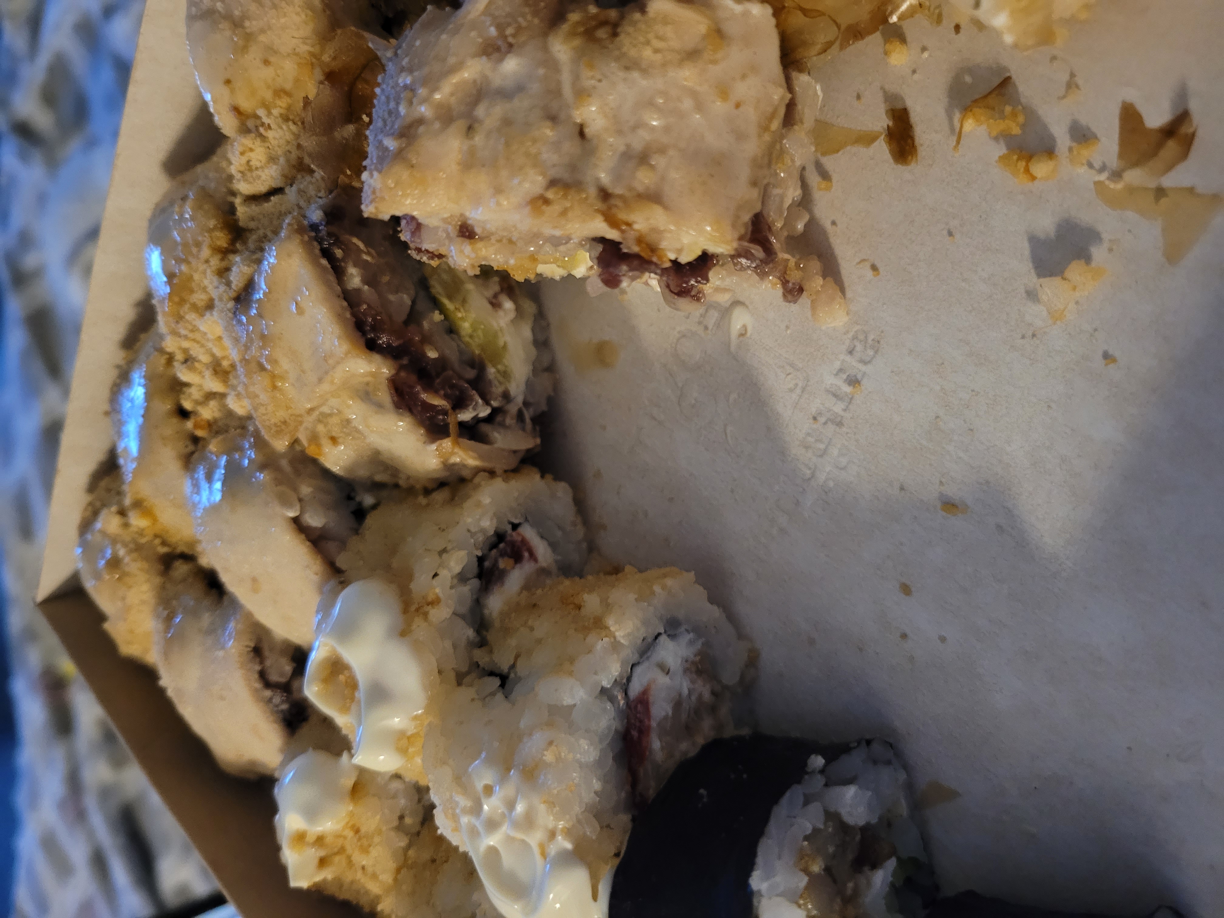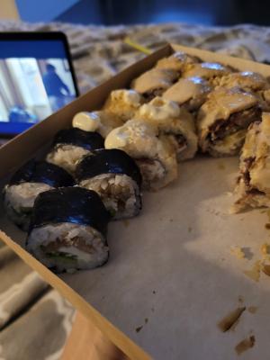 - "Колорадо": жареный лосось в соусе терияки, сыр чеддер, соус сырный, криспи - 8 шт.