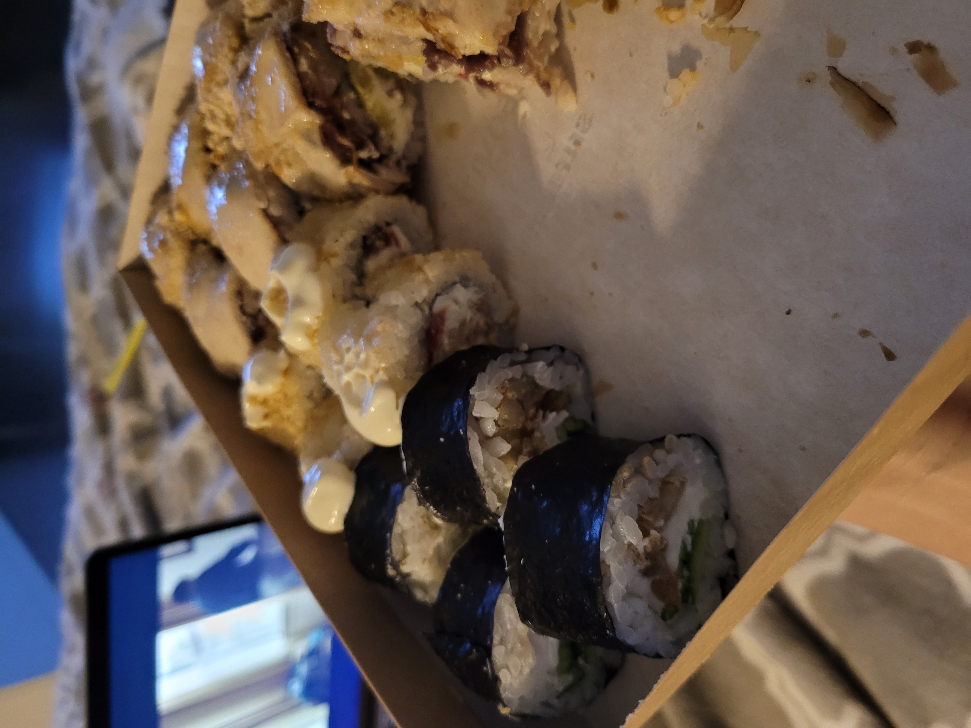 - "Дентон": бекон, овощи-гриль, сливочный сыр, омлет тамаго, соус терияки и соус спайси - 8 шт.