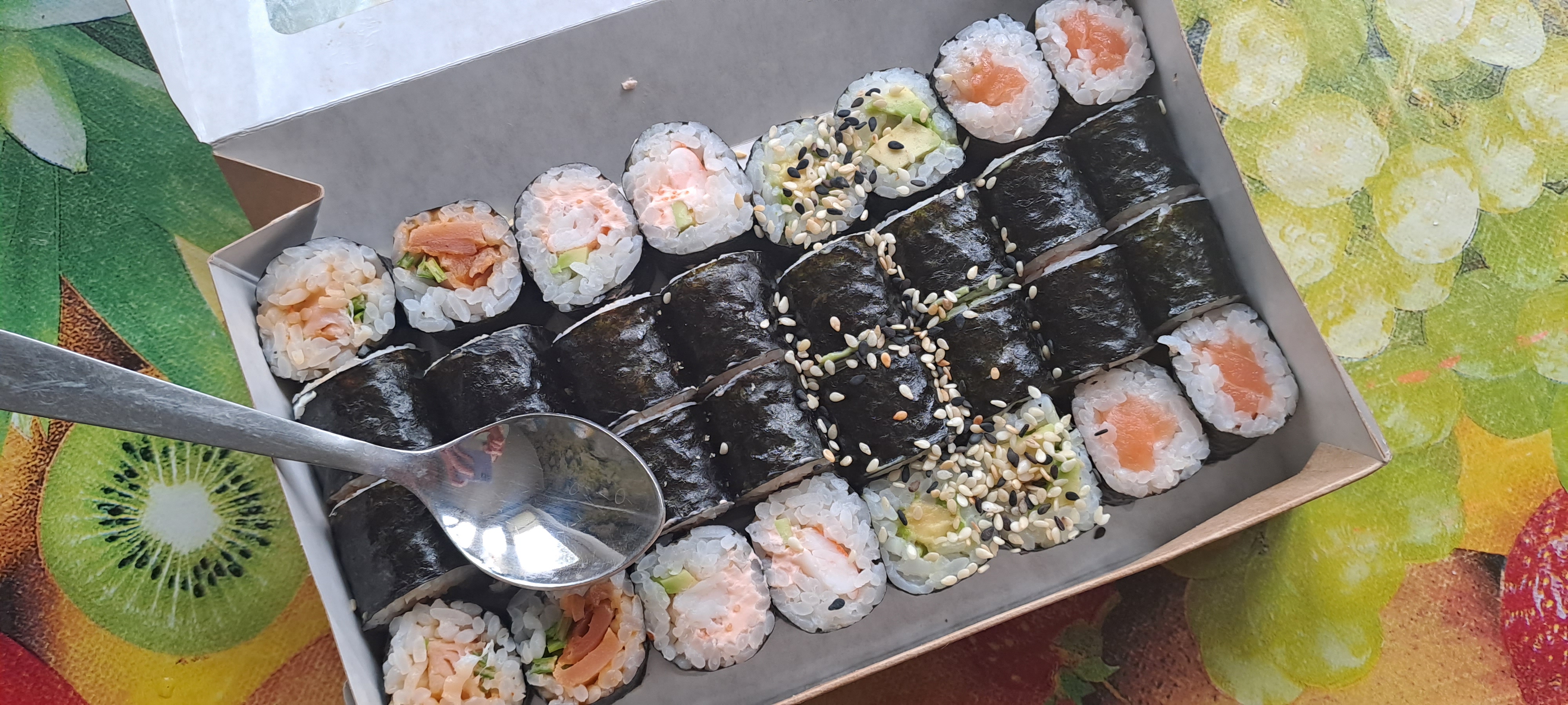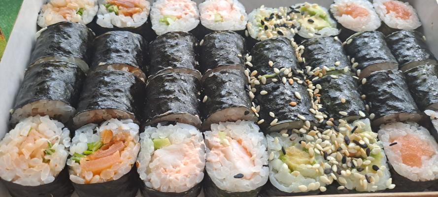 - "Манхеттен": филе лосося, сливочный сыр, авокадо, огурец, кунжут - 8 шт.
