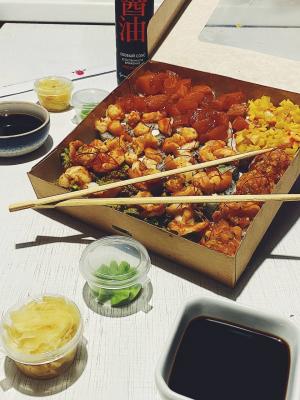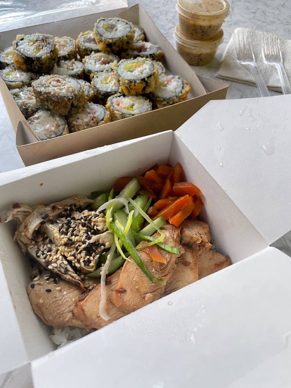 - тяхан со свининой чашу в соусе терияки (размер "М"): японский рис, обжаренный в кунжутном масле с яйцом, соус терияки, свинина чашу, морковь, кунжут, репчатый рук, лук перо зеленый- удон с цыпленком в кисло-сладком соусе (размер "М"): пшеничная лапша в кисло-сладком соусе, цыпленок, пекинская капуста, морковь, спаржевая фасоль, ананас, яйцо, лук перо зеленый, нори