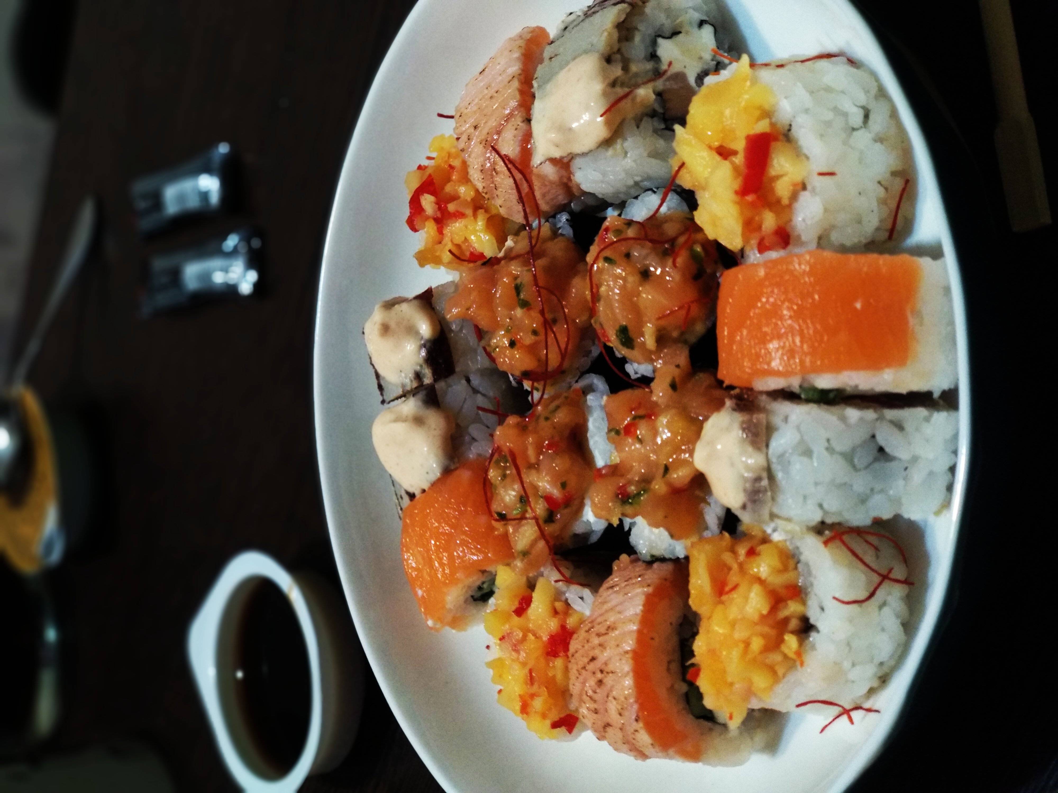 - "Манчестер": жареное филе лосося, такуан, сливочный сыр, омлет тамаго, соус лос-анджелес, кунжут - 8 шт.