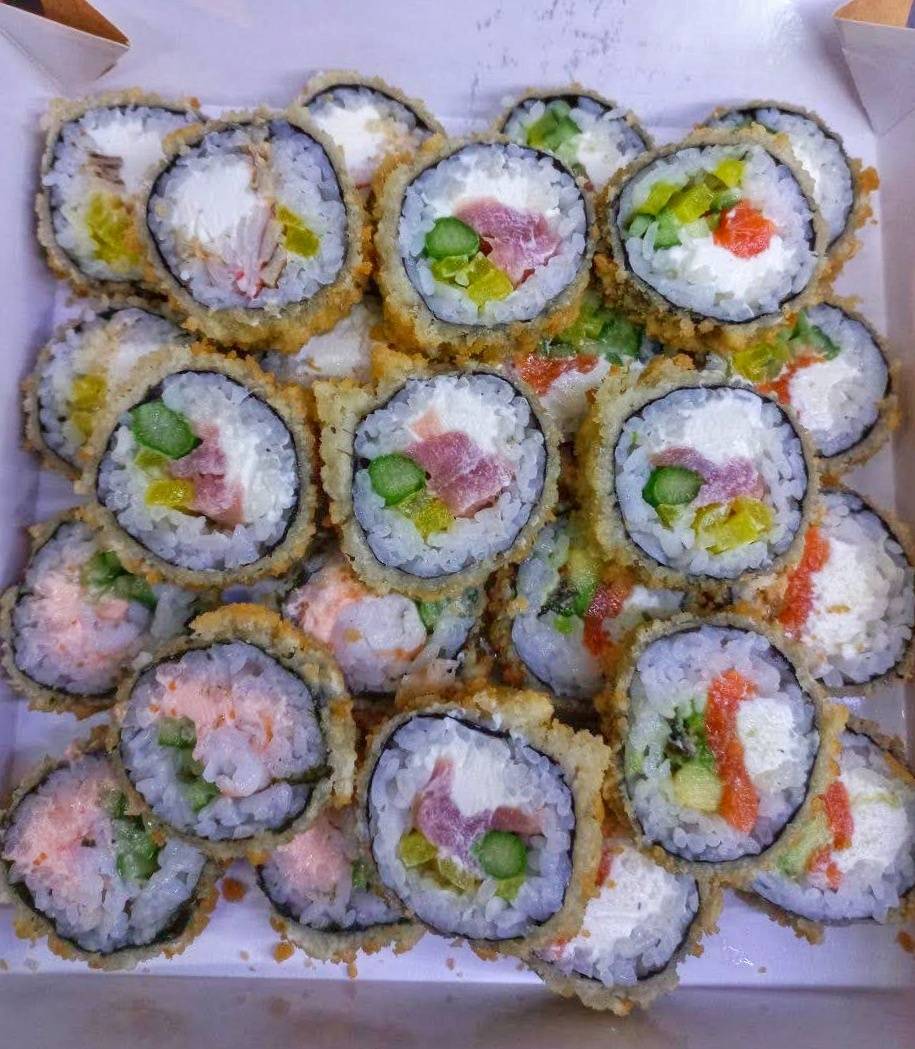 - "Пабло Фрай" (острое): креветка, сливочный сыр, огурец, имбирь маринованный, соус ореховый, панировка - 10 шт.