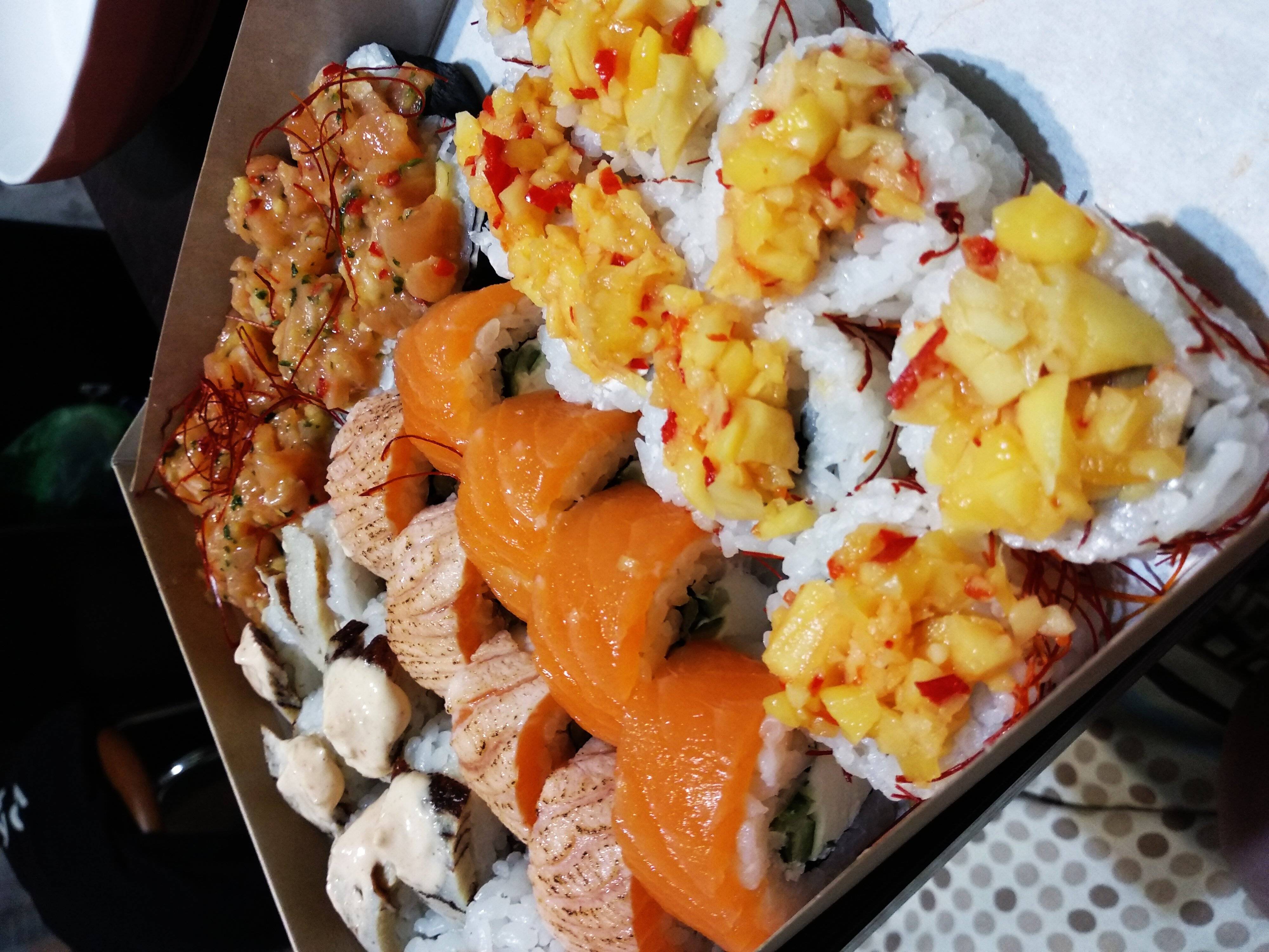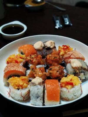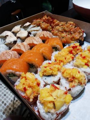 - "Ролл с лососем и манго в кунжуте": филе лосося, сливочный сыр, салат айсберг, манго, кунжут, кешью - 8 шт.