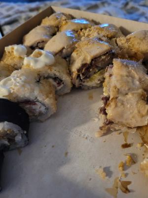 - "Ролл с жаренным окунем и ореховым соусом": жареный окунь, сливочный сыр, огурец, кунжут, соус ореховый - 8 шт.