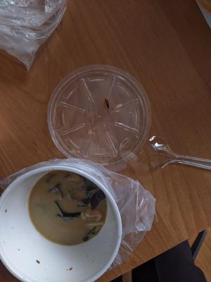 - том кха с цыпленком: бульон, кокосовое молоко, цыпленок, сливки, томаты черри, шампиньоны, лайм, перец чили, кинза, лук перо зеленый, онигири (острое)