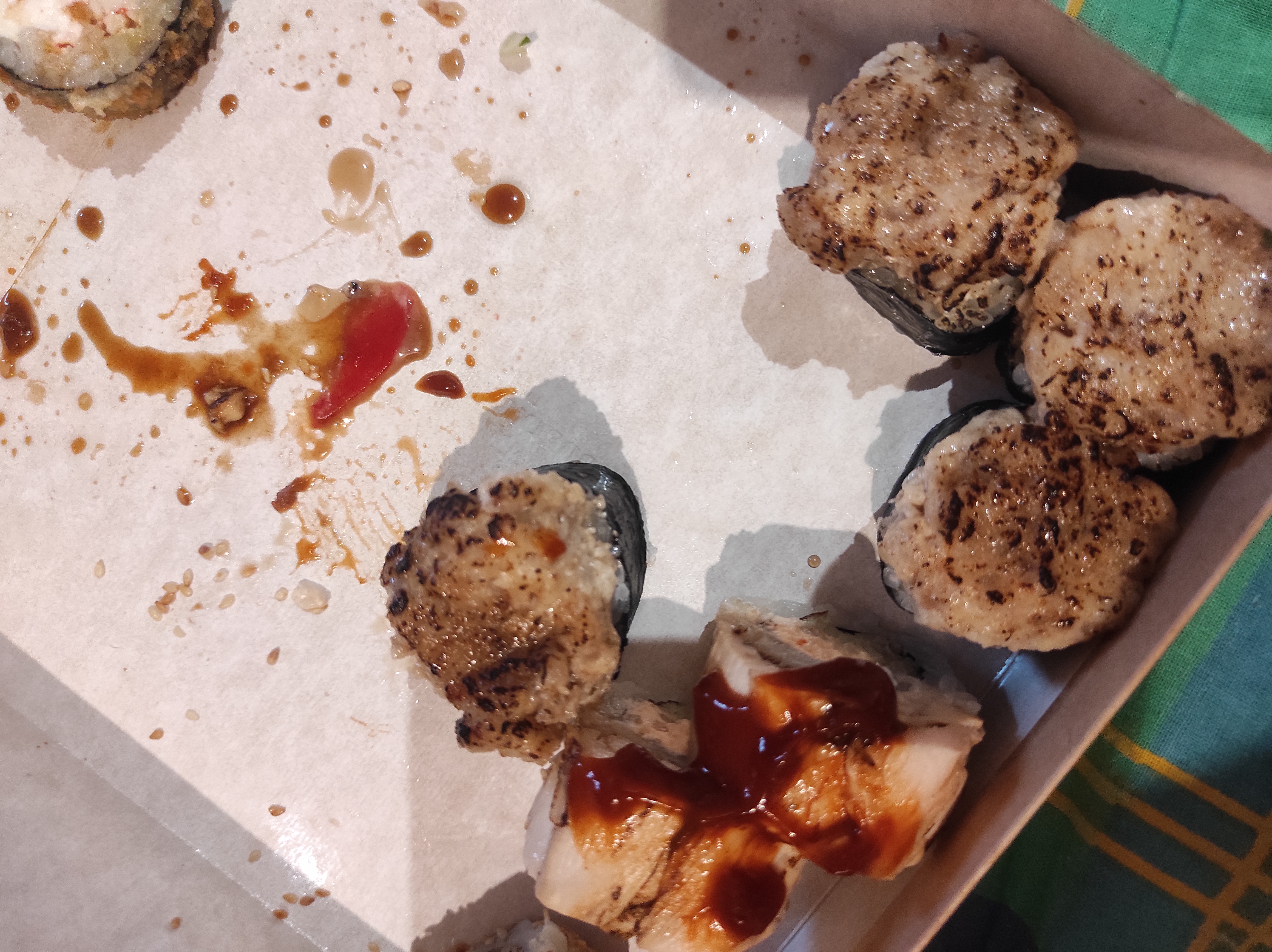 - "Дентон": бекон, овощи-гриль, сливочный сыр, омлет тамаго, соус терияки и соус спайси - 8 шт.
